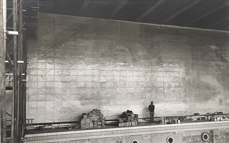 „Von hohen Leitern aus hat unser Vater die Wand mit Glasur, die er in eine Konservendose mit einem Auslassloch füllte, das er mit dem Finger verschloss, wenn er den Farbstrahl unterbrechen wollte, mit schwingenden Bewegungen bemalt. Das Verfahren erinnert an Jackson Pollocks dripping Technik. Nach dem Trocknen der Glasur wurde jede Keramikplatte erneut gebrannt“, erinnert sich Birte Mosny. Jede einzelne Platte sei anschließend in der Wand verankert und zusätzlich mit Mörtel befestigt worden.