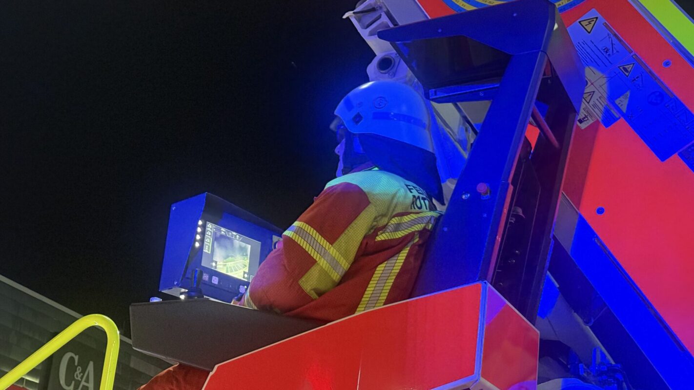 Die Drehleiter wurde vor dem Markt positioniert, vor einem um diese Zeit geschlossenen Modeanbieter. Unterdessen packten letzte Kunden ihre Einkäufe in ihre Autos. Knapp 20 Minuten später sollte der Markt schließen. Ein paar Kunden blieben noch eine Weile auf dem Parkplatz, um das Schauspiel zu beobachten.
