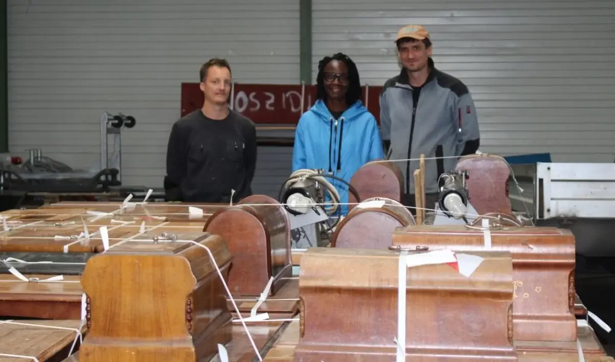 Rottweil – Mit in den Container werden auch zahlreiche Kisten mit Stoffen kommen, die von hiesigen Firmen gespendet wurden. Die Nähmaschinen stammen unter anderem von der Oberndorfer Berufsschule, die ihre alten elektrisch betriebenen Maschinen gestiftet hat. Dazu hat Houma Kustermanns Zahnarztkollegin Dr. Uta Borrmann aus Dornhan ganze 36 Maschinen von ihren Bekannten und Patienten gesammelt, elektrische und solche mit Fußantrieb, teils richtige Familienschätze, die nun von Alex Lange und Frieder Sigle versandfertig verpackt werden. Die beiden jungen Schreiner unterstützen die Arbeit von Houma Kustermann ehrenamtlich.