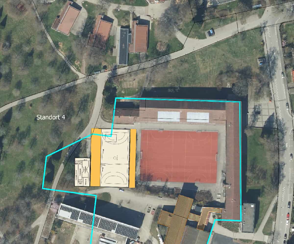 Nach einer Prüfung hat die Verwaltung nun eine neue Variante vorgelegt – und auch gleich zur Annahme empfohlen: Zwischen dem AMG und der Realschule, also in Verlängerung des Spielfelds im Innenhof des AMG in Richtung Wäldle. Der Anbau für die Turner, für den der Gemeinderat plädiert hatte, wurde ebenfalls mit einbezogen. Auch ein Vorteil des Standorts: Der Bolzplatz der Konrad-Witz-Schule, der für den Bau in der Variante eins hätte weichen müssen, bleibt erhalten. Nachteil: Es fallen 60.000 Euro standortbezogene Kosten an, nämlich für Änderungen von Wegen sowie unterirdischen Leitungen. In dieser Hinsicht wäre nur die Variante zwei teurer, und zwar deutlich: 230.000 Euro, weil Wege und Leitungen verlegt werden müssen und eine Bebauungplanung erstellt werden muss. Letzteres ist bei den drei andern Varianten nicht nötig.