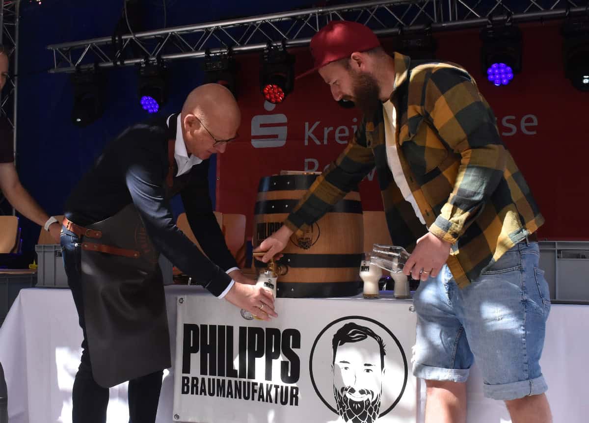 Das 37. Stadtfest ist eröffnet. Oberbürgermeister Ralf Broß durfte zum letzten Mal in dieser Eigenschaft das Fall anstechen. Und Braumeister Philipp Schumpp hatte es so gut vorbereitet, dass kein Topfen daneben ging.