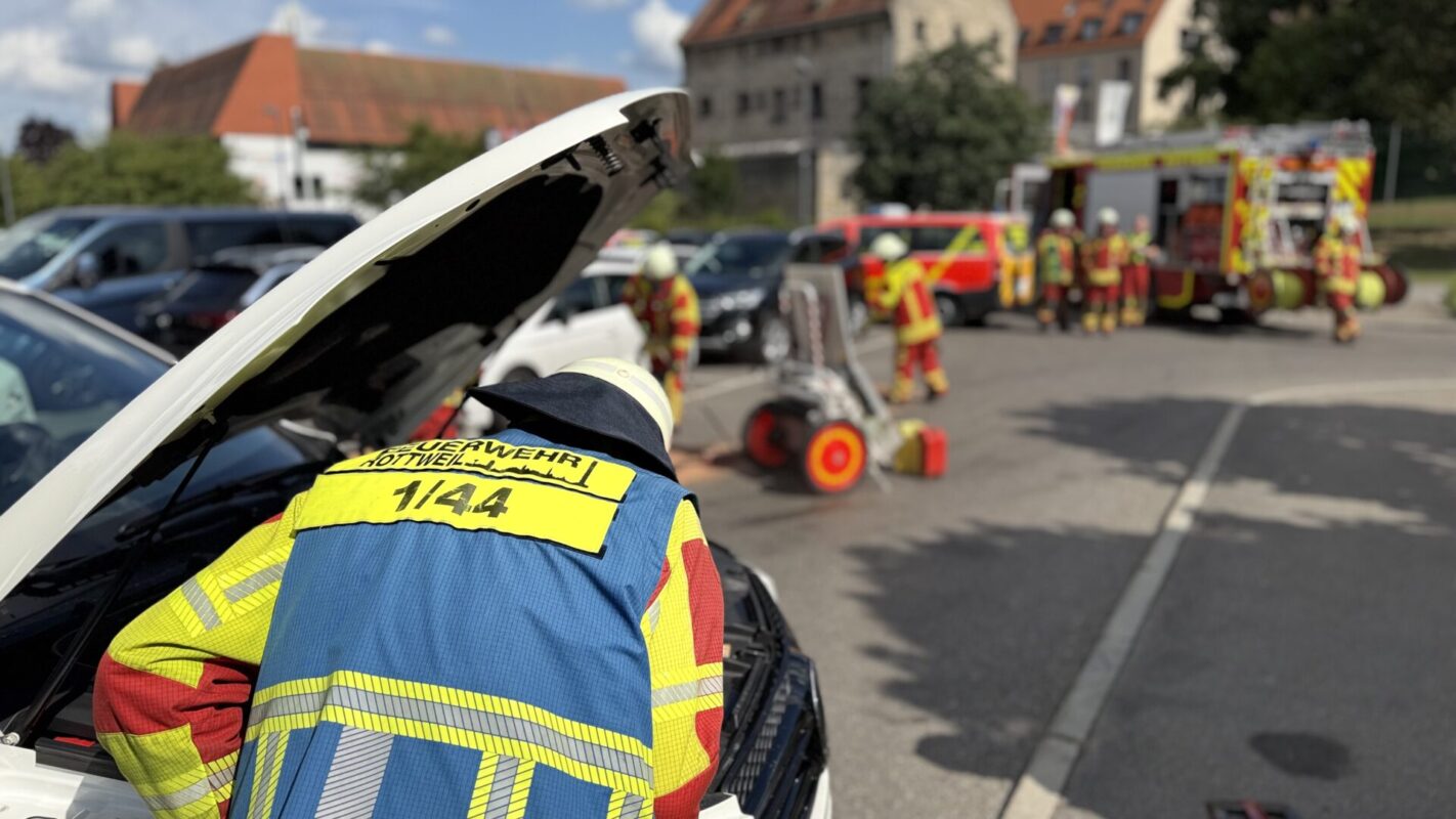 Es passierte auf dem Parkplatz am Nägelesgraben, dem sogenannten Eisplatz. Aus dem Motorraum eines SUV schlugen Flammen. Der Fahrer hielt seinen Mercedes Biturbo an, öffnete die Motorhaube und hatte gleich Glück im Unglück: Aus einer nahen Gaststätte kam ein schneller Ersthelfer mit Wasser herbei. Die Flammen waren damit rasch gelöscht, die Feuerwehr aber war schon gerufen. Mit vier Fahrzeugen rückten die Einsatzkräfte um Stadtbrandmeister Frank Müller an.