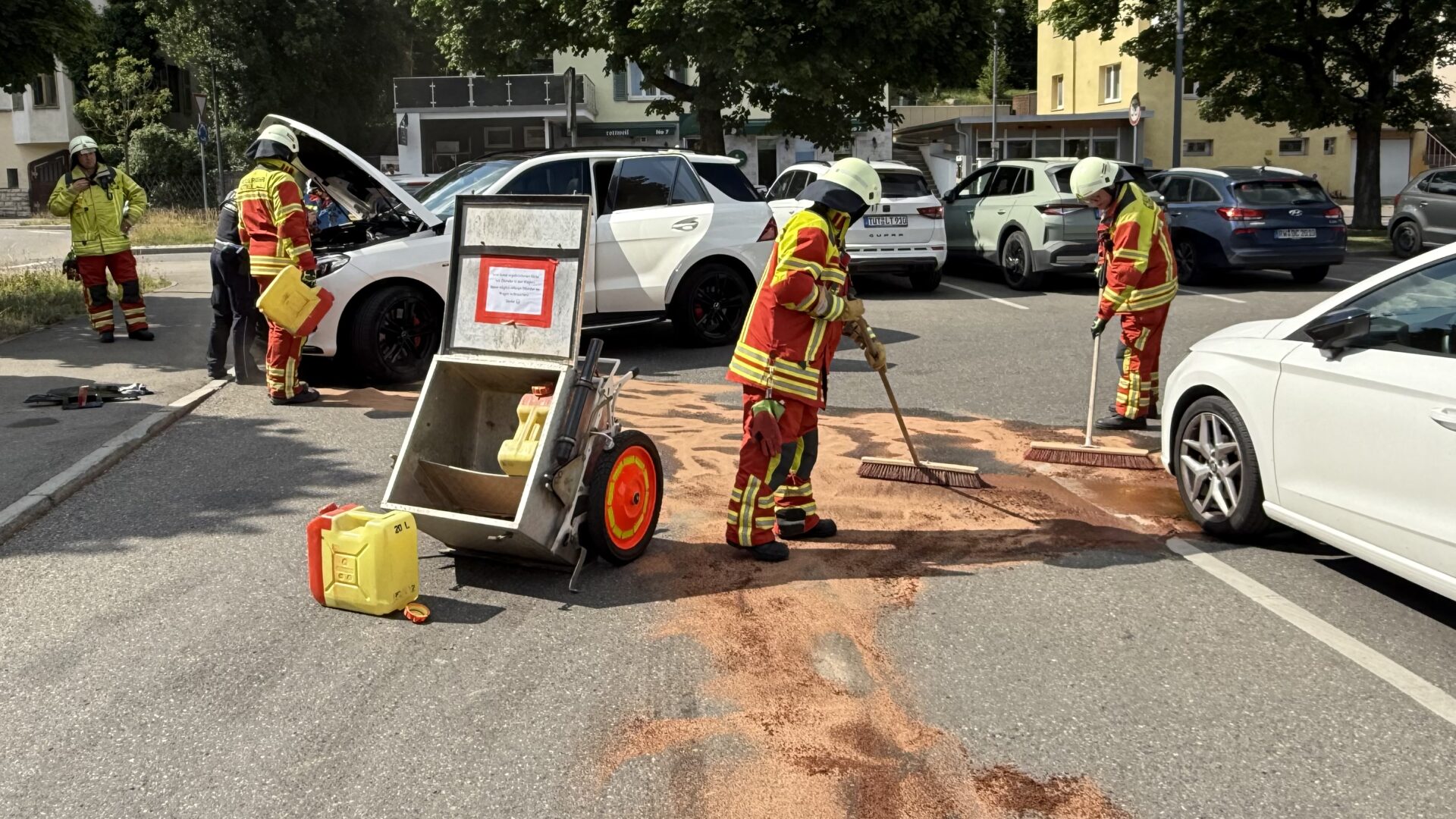 Zu löschen hatten sie nichts mehr, allerdings verlor der Wagen massiv Öl. Das hatte sich schon auf einer größeren Fläche auf dem Parkplatz verteilt. Und das musste gebunden werden, was die Floriansjünger dann übernahmen. Der Grund für den hohen Ölverlust und wohl auch für den Motorbrand: Der Öldeckel hatte gefehlt, die schwarze Flüssigkeit konnte offenbar ungehindert herausströmen.