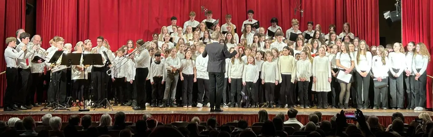 Der Unterstufenchor sang in der Folge mit Klavierbegleitung zweistimmige Weihnachtslieder, a capella gefolgt vom Lehrerchor „Cantus Albertinus“ mit weihnachtlichen Stücken unter anderem von Michael Praetorius. Zusammen mit den Sängerinnen und Sängern der Kursstufe und Pauline Schick als Sopransolistin wurde es mit Lorenz Maierhofers „Der Herr hat seinen Engeln befohlen“ sogar doppelchörig. Den letzten Teil des Konzertes gestaltete der Schulchor, unter anderem mit einem witzigen Dialog zwischen unwilligen Herbergswirten und Maria und Joseph auf der Suche nach einer Unterkunft. Das wunderbare adventliche „Veni, veni Emmanuel“ bildete hier einen Höhepunkt. Zum Abschluss sangen der Chor zusammen mit den Gästen gemeinsam das Lied „O du Fröhliche“ – ein bewegender Moment, der die Verbundenheit der Schulgemeinschaft spürbar machte.