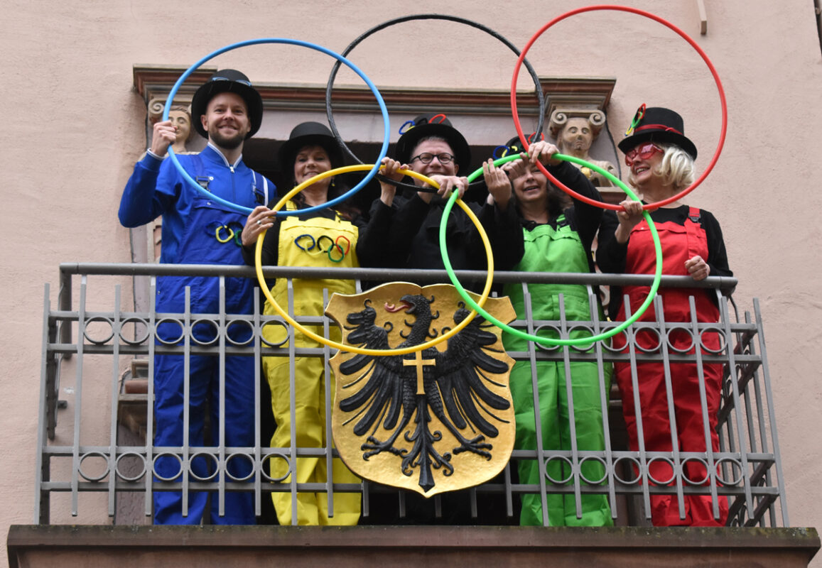 Rottweil – Sie feierten im Rathaus drin, nicht öffentlich. Aber zum Gruppenbild versammelten sich alle sportlich Verkleideten, einschließlich des Fußballers OB Ruf zum Gruppenfoto.