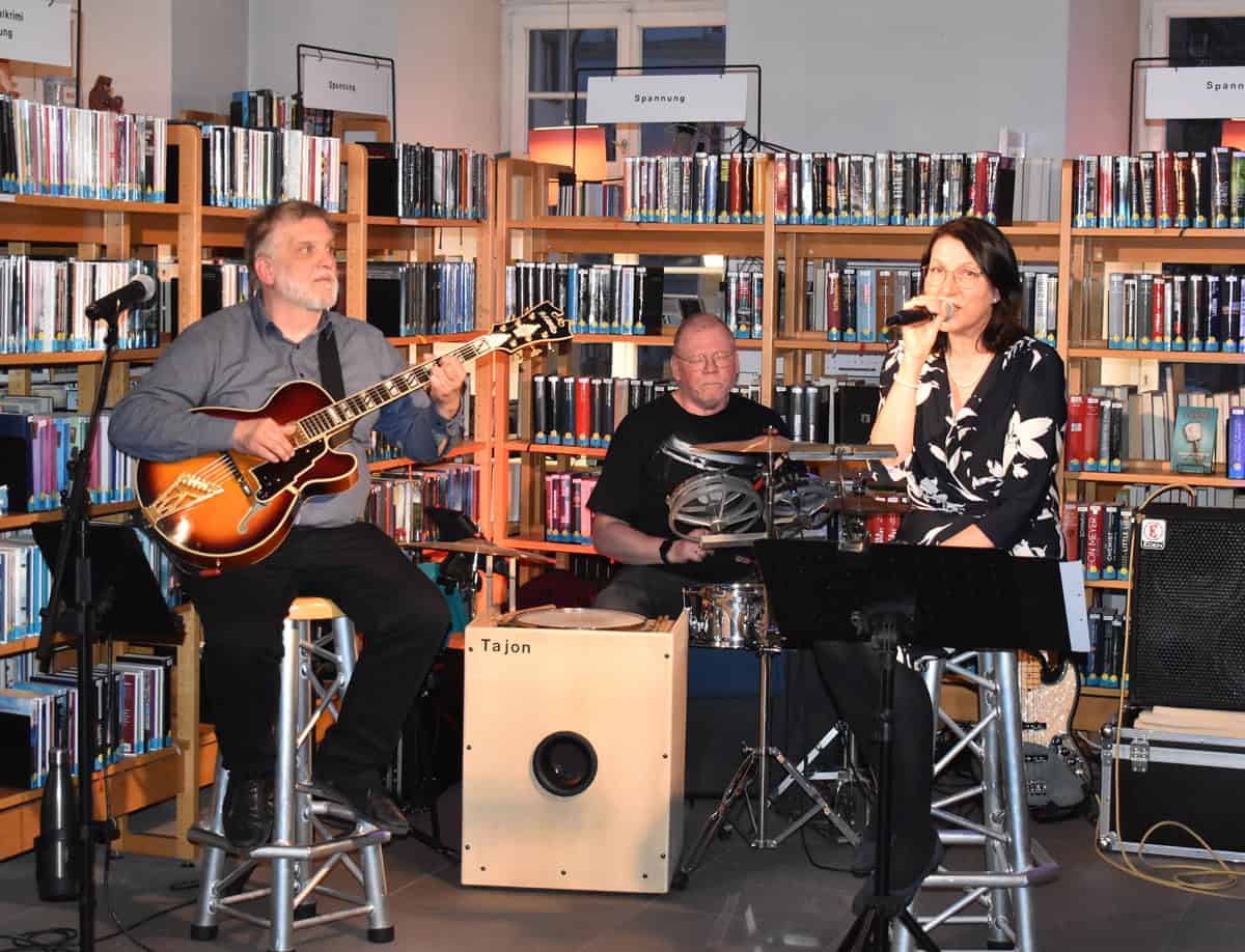 Swing und Bossa Nova zum Zuhören zwischen Büchern: „Two to listen to“ mit Freund in der Stadtbücherei.