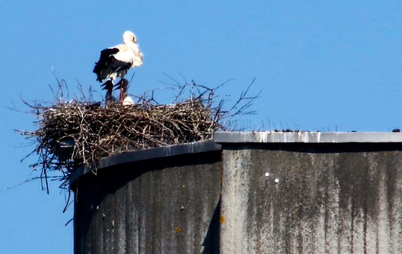 Lange Zeit konnte man nicht sehen, wie viele Junge im Nest sind, weil das Nest in diesem Jahr einen hohen Rand hat. So saßen die Jungvögel in der tiefen Mulde versteckt und waren lange Zeit nicht zu sehen. Im Gegensatz zu den Dietinger Störchen, die das Brutgeschäft wegen Futtermangels abbrechen mussten, haben die Rottweiler Störche zwei prächtige Jungvögel im Nest.