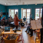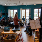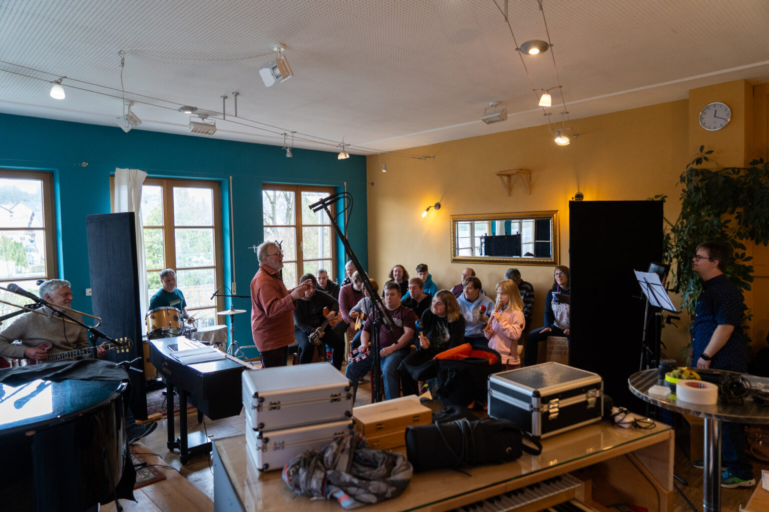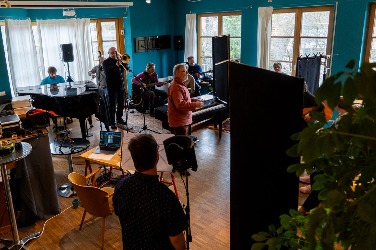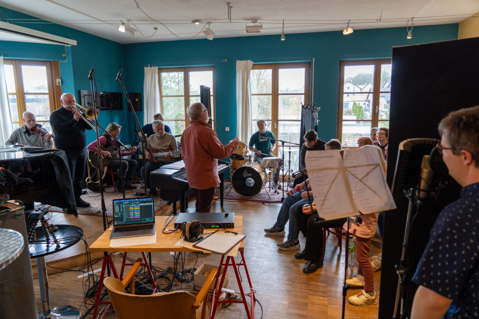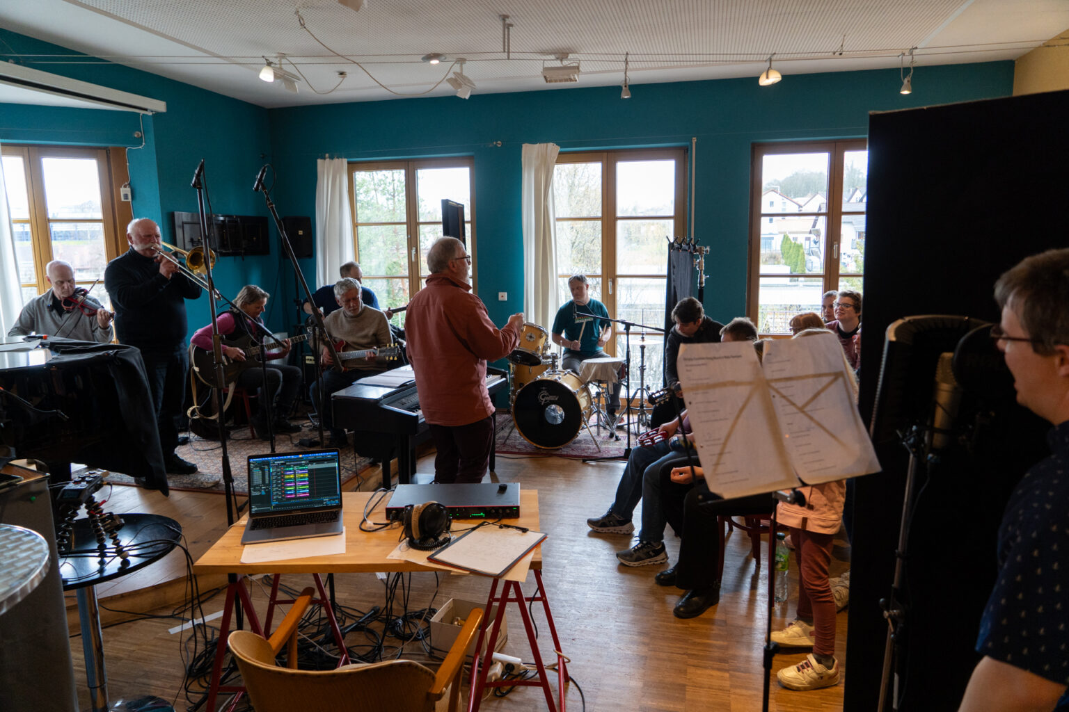 Die Band ist bei der Aufnahme des Songs aufgeteilt. Schwere schwarze Vorhänge unterteilen die einzelnen Gruppen, und überall sind Mikrofone platziert. Der Song wird live eingespielt, und Sophia Schiller als Tonmeisterin hört über ihren Kopfhörer sehr genau, wo es manchmal hakt. Und es hakt oft. Immer und immer wieder müssen einzelne Passagen neu aufgenommen werden. Manchmal werden auch nur einzelne Register der Inklusionsband, in der Menschen mit Handicap mit Amateurmusikern aus der Region zusammenspielen, aufgenommen.