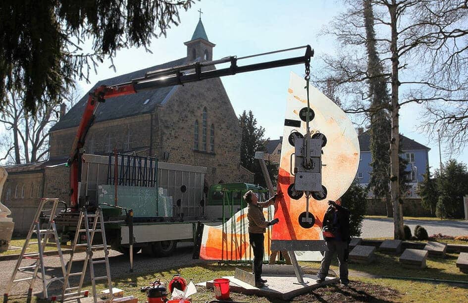 Wer den Friedhof an der Ruhe-Christi-Kirche nun betritt, wird es kaum übersehen: Fast vier Meter ist das Gebilde hoch – zwei zueinander gewinkelte Glaselemente, die an Flügel erinnern und je nach Blickwinkel regelrecht aufzubrechen scheinen.