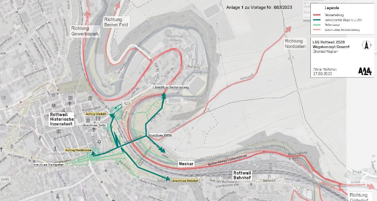Die neue Planung für die favorisierte Variante zwei stellte Fachbereichsleiter Rudolf Mager vor. Vor allem soll es nur einen Aufzug in die Stadt geben, und zwar bei der Hochbrücke. Der ursprünglich vorgesehene Aufzug am Viadukt wird gestrichen, ein Aufgang mit Treppen wird beim Spital gebaut. Das Betriebsgebäude der ENRW soll erhalten werden. Die Brücke über die Bahngleise („Gartenschaubrücke“) soll auf jeden Fall gebaut werden, allerdings etwas kürzer als ursprünglich geplant.