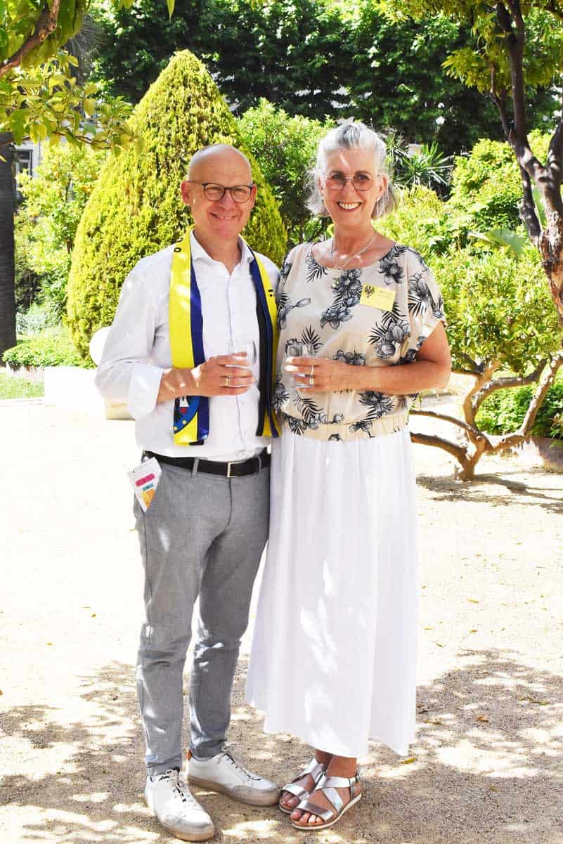 „Die deutschen Freunde mögen die Sonne nicht“, übersetzte Christine Krapf-Laborde, Vorsitzende des Partnerschafts-Komitees, die Bemerkung von Hyères Bürgermeister Jean-Pierre Giran zum Beginn des offiziellen Empfangs der Stadt: Die meisten Gäste hatten sich im Schatten aufgestellt, um die Reden zu hören. Giran zeigte sich beeindruckt von der großen Delegation aus Rottweil. Er betonte die Wichtigkeit der direkten Begegnungen zwischen den Menschen verschiedener Länder – gerade in dieser Zeit. „Wir haben eine Besonderheit: Wir sind polygam“, scherzte Giran – und meinte damit die seit 42 Jahren bestehende Partnerschaft mit der Stadt Koekelberg in Belgien, deren Bürgermeister Ahmed Laaouej ebenfalls dabei war.