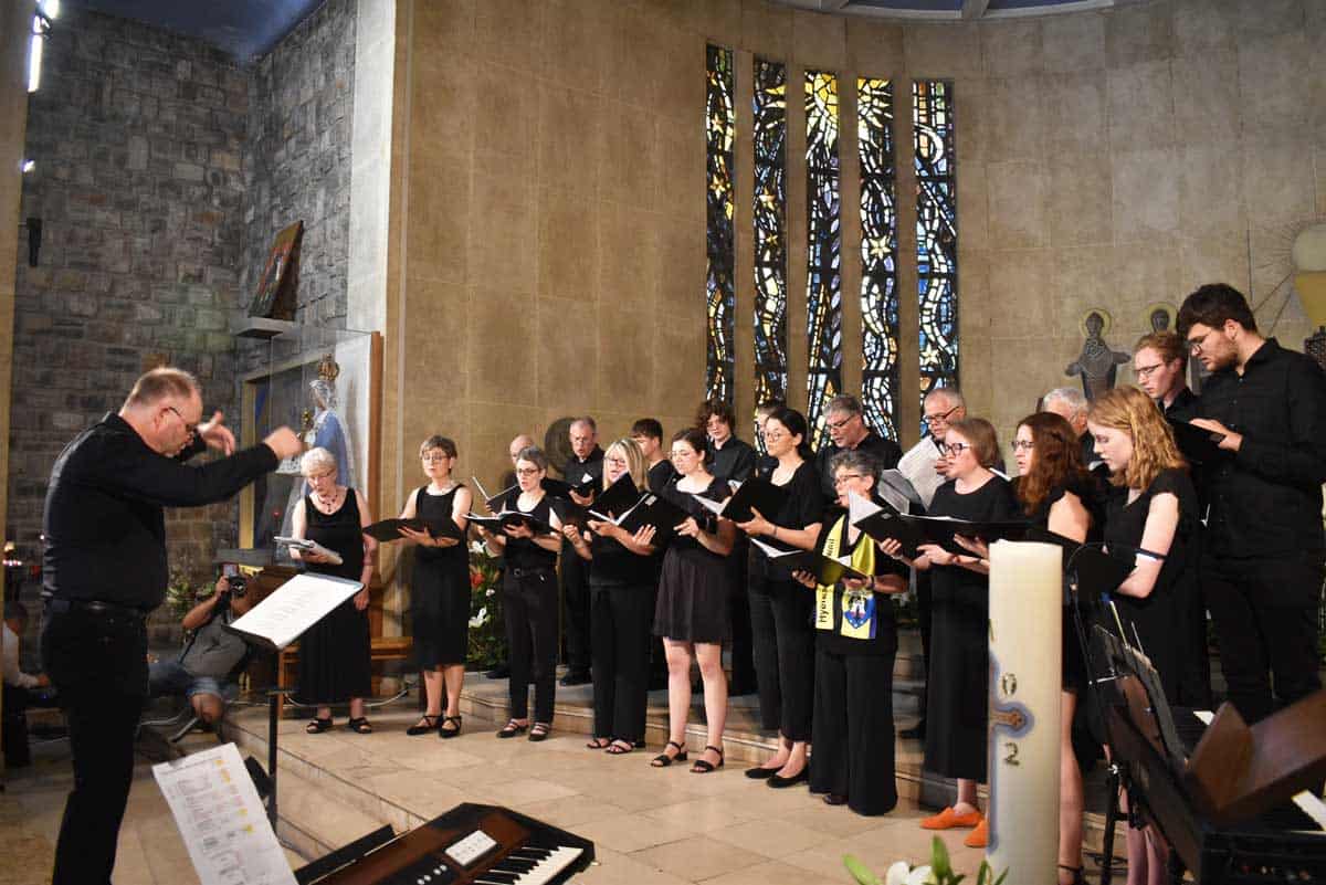 Patrick Mink leitete den Münsterchor, der eine interessante Auswahl von geistlichen, aber auch weltlichen Liedern brachte – von Mozart („Ave verum“) bis John Lennons „Imagine“ beeindruckte der Chor die Zuschauer. Als Solisten taten sich Sängerin Verena Mink, Ruben Overmeyer an der Klarinette, Elias Mink am Cajon und Professor Helmut Cromm am Keyboard hervor.