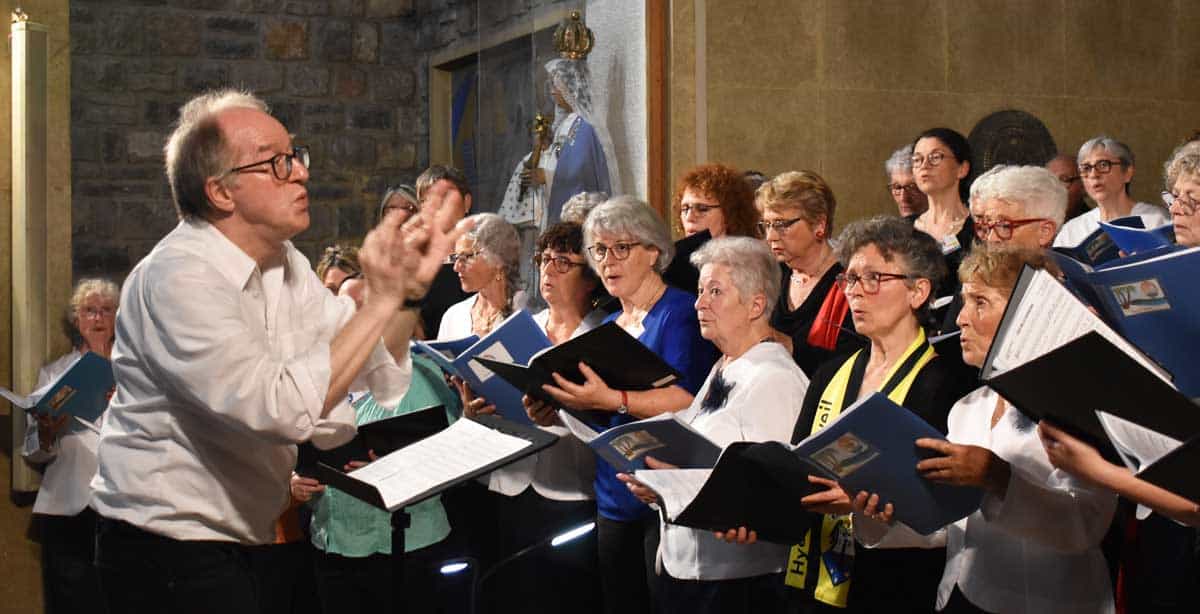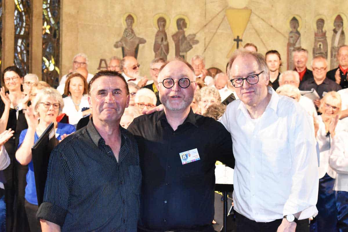 Musikalisch in Bestform und mehrsprachig zeigten sich die Gastgeber von „Brise Marine“ unter ihrem neuen Dirigenten Patrice Thiney. Ein „Ave Maria“ und ein Lied von Orlando di Lasso aus der Renaissancezeit, Musik von Händel und russische Lieder: Begleitet von Laurent Signorini am Keyboard beeindruckten die Franzosen das zahlreiche Publikum in der brechend vollen Kirche. Am Ende kamen alle drei Chöre auf die Bühne und bildeten mit über 70 Sängerinnen und Sängern ein beeindruckendes Ensemble. Beim „Abschied vom Walde“ und „Cent mille chansons“ wechselten sich Cromm und Thiney mit dem Dirigat ab.