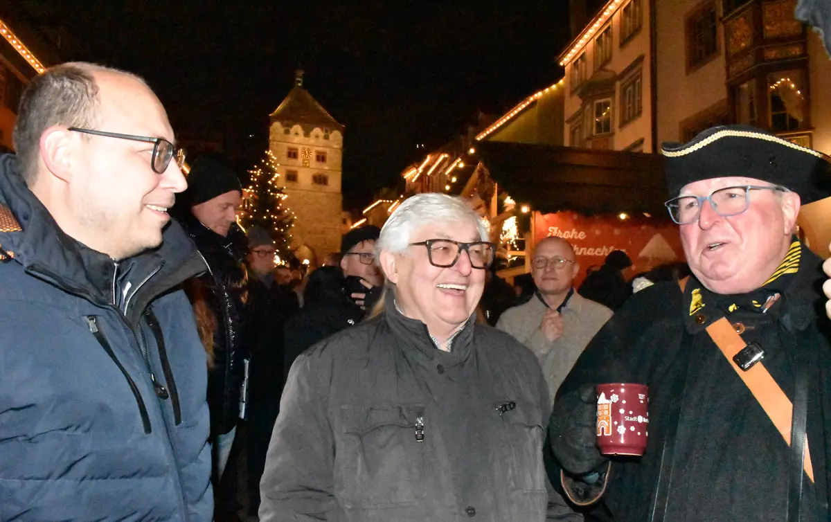 Der Rottweiler Weihnachtsmarkt ist eröffnet. Kurz nach 18 Uhr gaben Oberbürgermeister Dr. Christian Ruf, Tobias Rützel von Rottweil aktiv und Nachtwächter Wolfgang Müller dies bekannt.