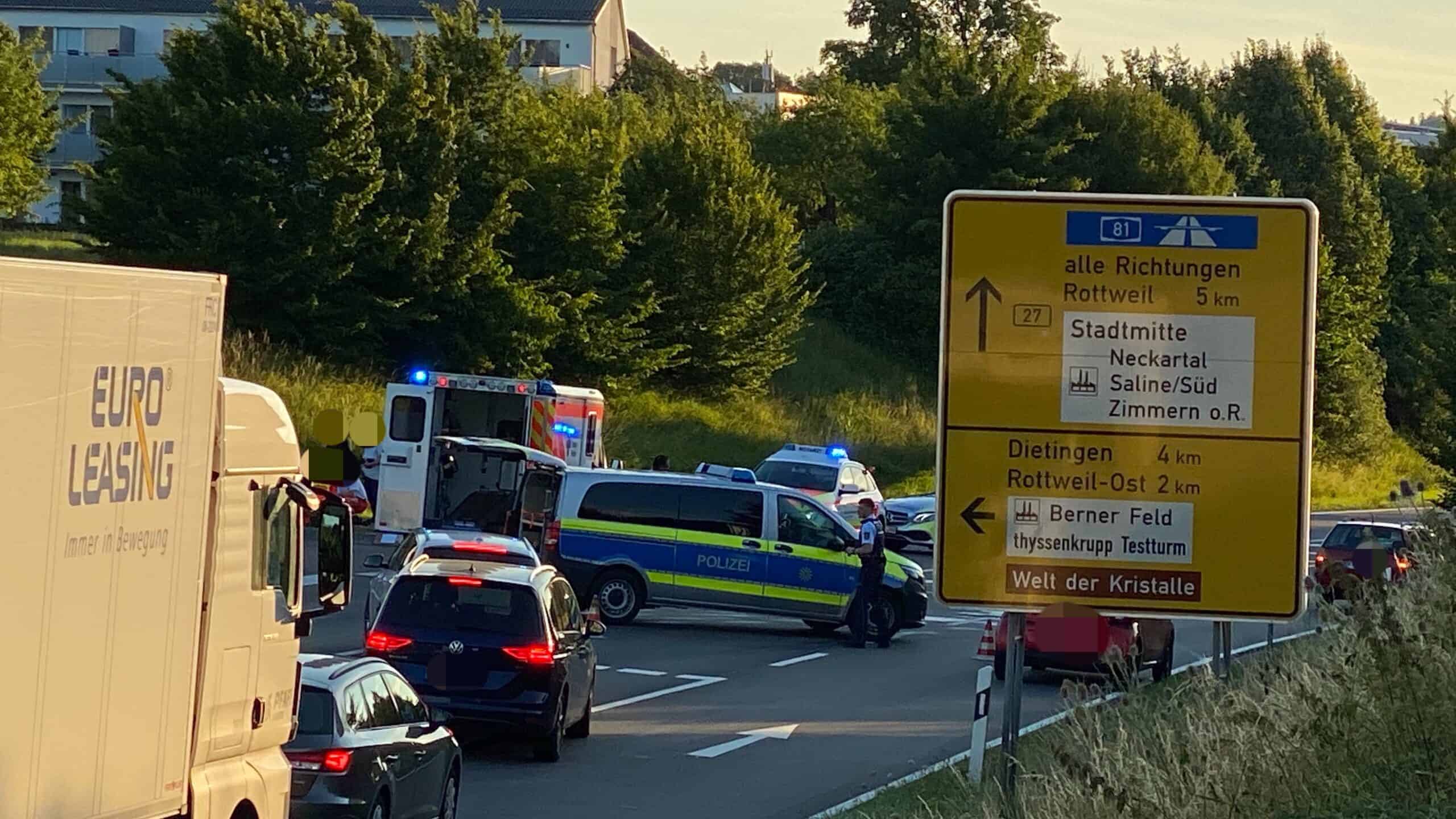 Die Unfallstelle befindet sich an der Abzweigung der B 27 zum Rottweiler Testturm. Offenbar sind ein Wagen und ein Motorrad zusammengeprallt.