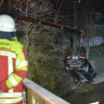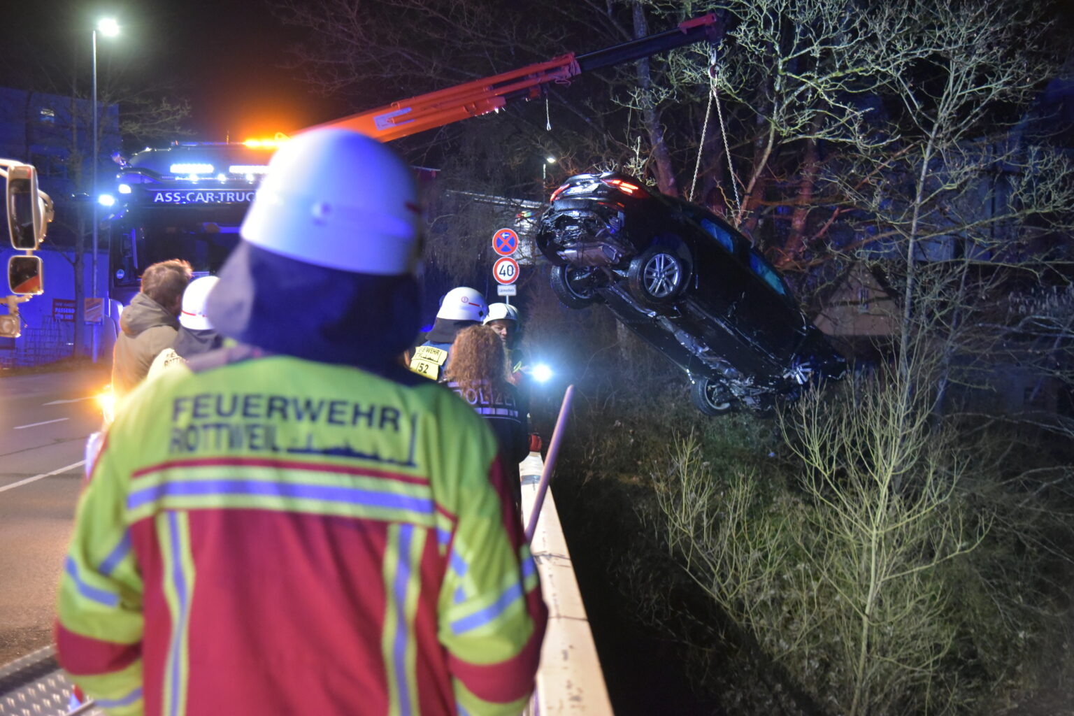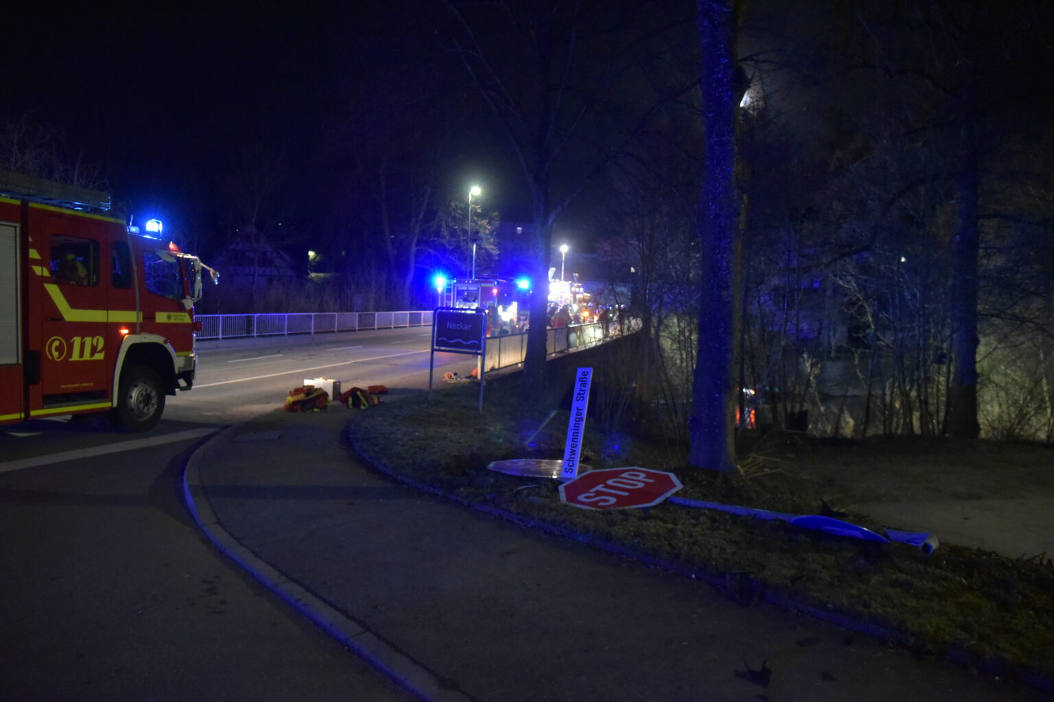 Spektakulärer Unfall in der Nacht auf Sonntag in Rottweil: Ein Audi A4 kam in der Tuttlinger Straße stadtauswärts von der Straße ab, riss ein Verkehrszeichen aus der Verankerung, flog regelrecht durch die Böschung und blieb im Neckar stehen, an der gegenüberliegenden Uferseite. Zwei Menschen wurden verletzt und kamen in eine Klinik. Die Feuerwehr errichtete Ölsperren, das Umweltamt kam zur Einschätzung der Lage hinzu.