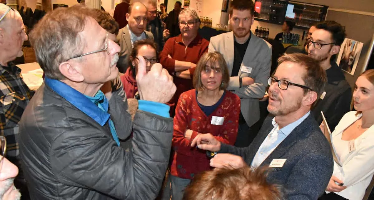 Nach den Impulsvorträgen stellten sich Bisinger, Abteilungsleiterin Sandra Graf und Projektleiter Micha Sonnenfroh den Bürgerinnen und Bürgern. Zeitweise war es kaum möglich, in Hörweite der Verwaltungsleute zu kommen, so dicht waren sie umlagert.