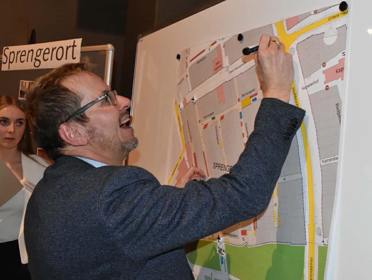 Beispiel Sprengerort. Hier musste Bisinger viele Fragen beantworten und erhielt viele Anregungen, von denen er etliche in einer Karte des Quartiers notierte. Poller ja – aber wohin? Weniger Einwohnerparkplätze innerhalb des Orts – aber der Kapuziner-Parkplatz ist oft voll mit Besuchern von Veranstaltungen dort, so dass die Anwohner leer ausgehen. Einen reinen Anwohnerparkplatz dort ausweisen – aber was machen dann die Kapuziner-Gäste? Einer hatte die Idee, am Heimburger-Kreisel einen Parkplatz zu schaffen. Zweifel wurden laut, ob dieser auch wirklich angenommen werde. Worauf Bisinger auf das Parkhaus Zentrum verwies, das im kommenden Jahr fertig sein soll.