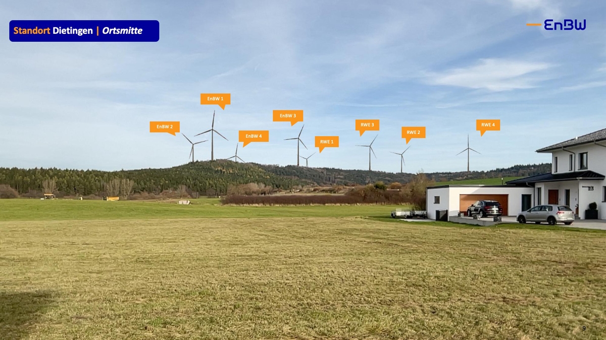 Die EnBW (Energie Baden-Württemberg AG) plant auf Dietinger Gemarkung vier Windkraftanlagen mit einer Leistung von je sieben Megawatt. Die RWE AG aus Essen (früher Rheinisch-westfälisches Elektrizitätswerk) wird auf Rottweiler Gebiet, im Wald bei Neukirch und Vaihingerhof, ebenfalls vier Anlagen bauen. Sie haben eine Leistung von je 6,8 Megawatt. Den Angaben zufolge können die vier EnBW-Anlagen den Strombedarf von 16.500, die der RWE den Bedarf von 16.000 Haushalten decken.