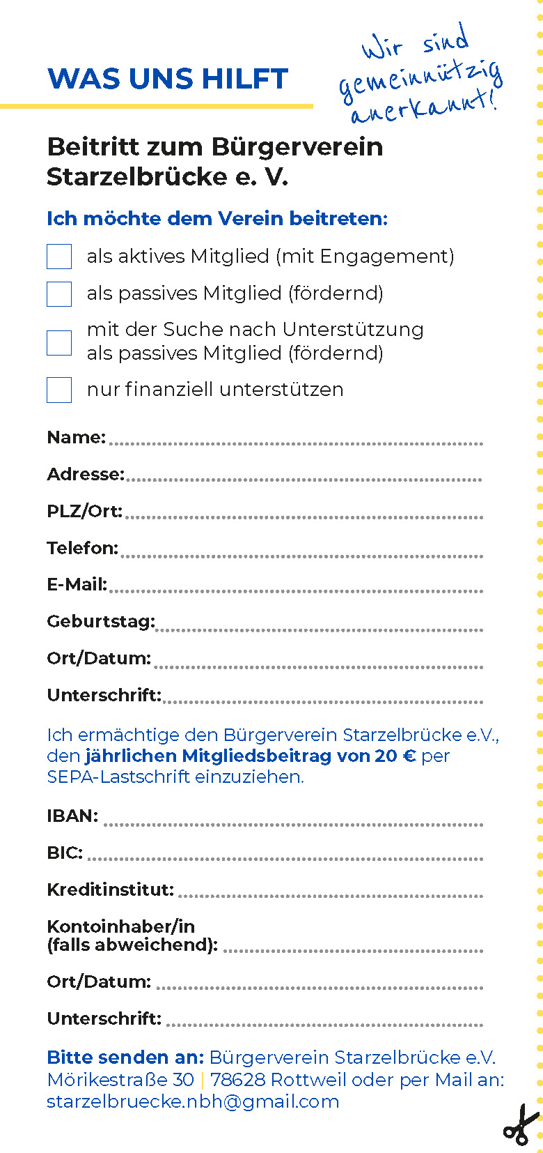 Natürlich werden aktive Helferinnen und Helfer für den weiteren Aufbau der Nachbarschaftshilfe gesucht, aber auch passive finanzielle Unterstützerinnen und Unterstützer gesucht. Infos dazu per E-Mail an starzelbruecke.nbh@gmail.com