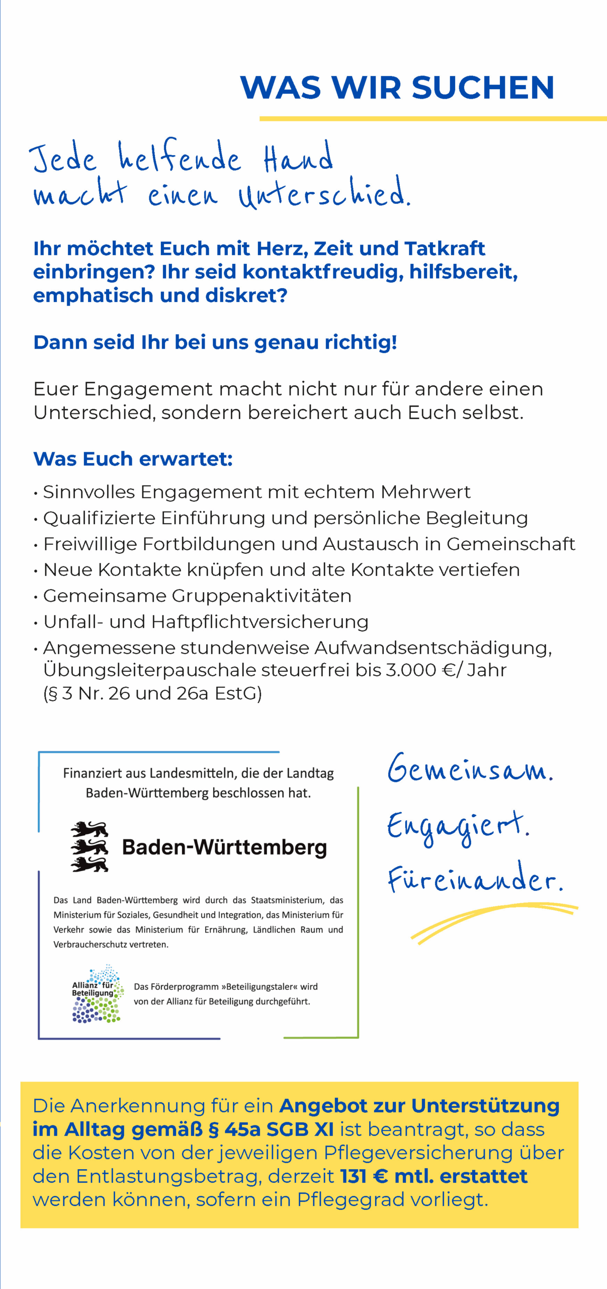 Das Ziel sei eine sorgende Gemeinschaft, in der sich Bürgerinnen und Bürger füreinander stark machen. Im Angebot sollen etwa die stundenweise Betreuung von Pflegebedürftigen und pflegebedürftigen Kindern sein zur Entlastung von Angehörigen, Begleitung bei Gängen zum Arzt, zum Einkaufen, zu Behörden oder zu kulturellen Veranstaltungen, Begleitung zu Terminen und Veranstaltungen, Unterstützende Hilfe bei der Hausarbeit, beim Kochen und bei der Wäschepflege, Vorlesen, Gespräche, Gesellschaftsspiele machen, Gemeinsames Spazierengehen und Bewegung.
