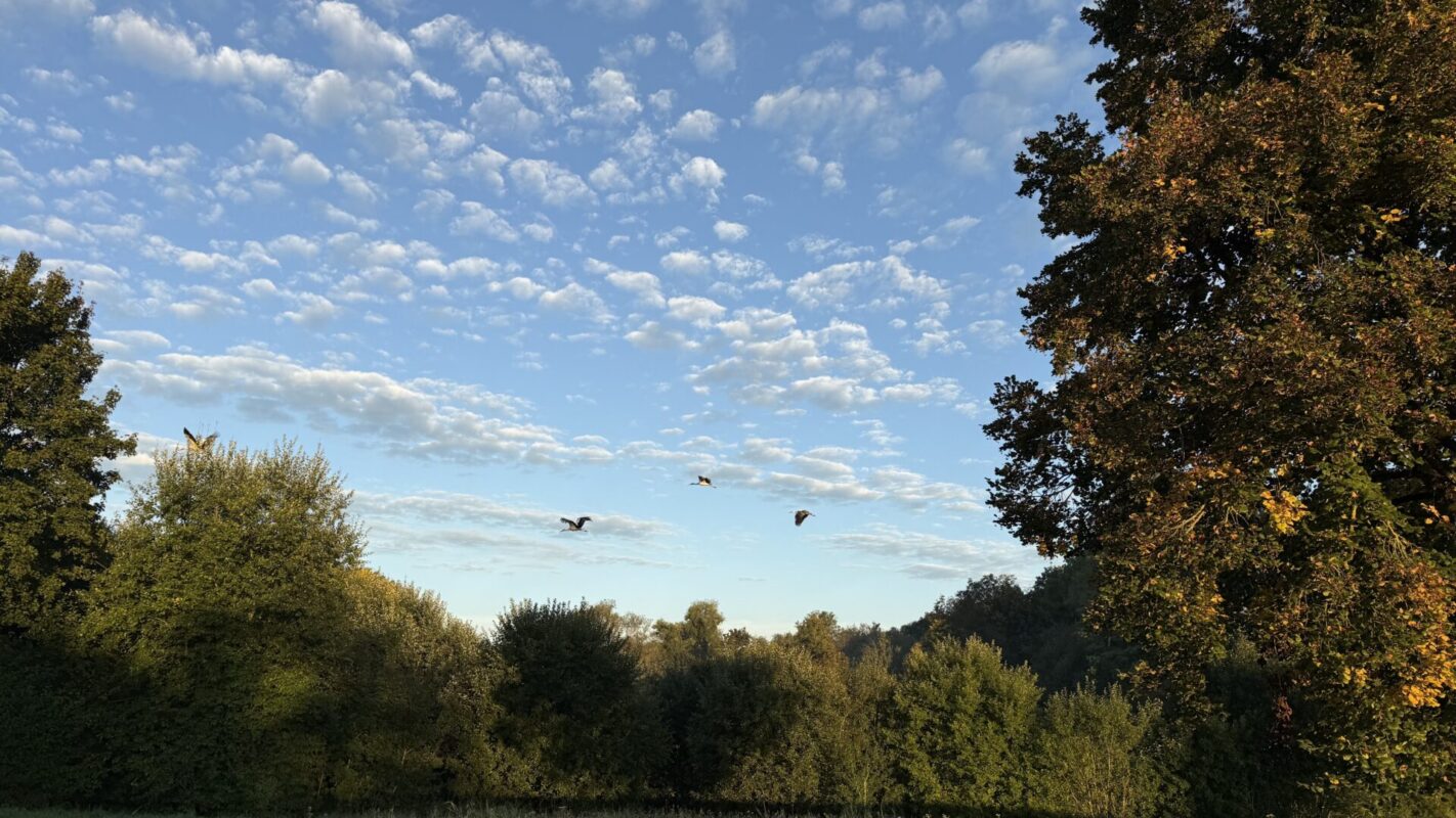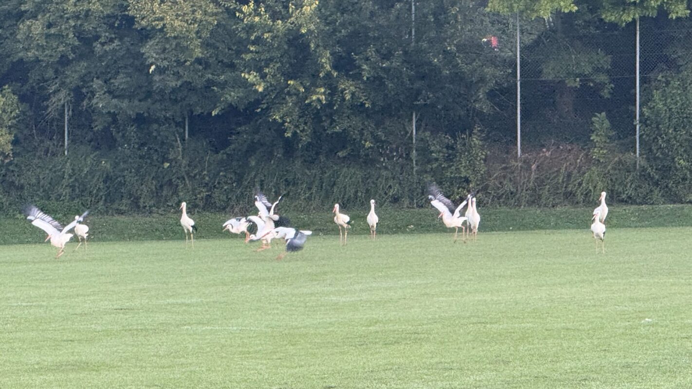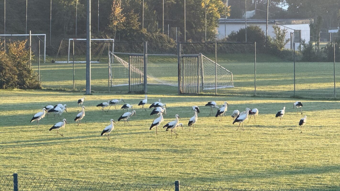 7.10 Uhr an diesem Samstagmorgen. Über die Sportplätze bei Rottweil streicht die Sonne, allmählich füllen Licht und etwas Wärme die Luft und die Landschaft. Und über den Köpfen der morgendlichen Spaziergänger: ein sanftes Rauschen. Störche fliegen ein. In größerer Zahl. Sie sammeln sich offenbar, zunächst auf einem der hinteren, schon etwas abgelegenen Sportplätze, dann auf dem letzten, dem Bolzplatz. Und schließlich, als sie auch dort keine Ruhe für ihr Palaver finden, auf einer leichten Anhöhe, einer Wiese zwischen Spazier- und Wirtschaftswegen. Handyobjektive folgen ihnen.