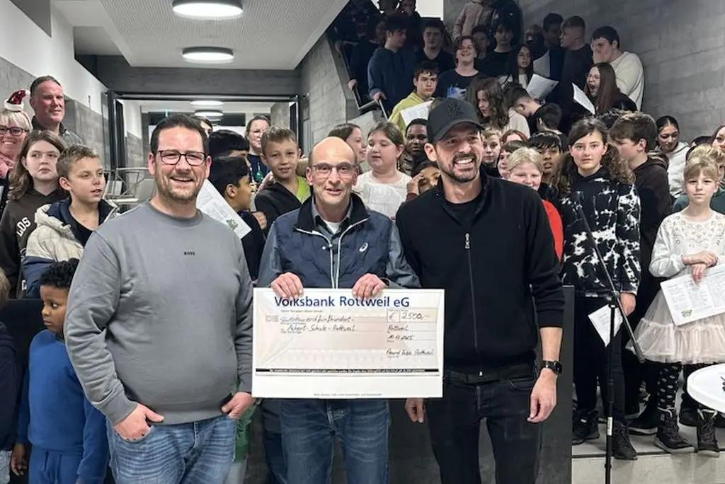 Jan Hofelich und Marian Burkardt überreichten der Schulleitung einen symbolischen Scheck über 2500 Euro zur Unterstützung des geplanten gemeinsamen Schullandheims für alle Schülerinnen und Schüler am Feldberg. Schulleiter Stephan Keßler betonte in seinem Dank: „Herzlichen Dank für diese großzügige Unterstützung. Damit kommen wir der Realisierung unseres Projekts einen großen Schritt näher.“