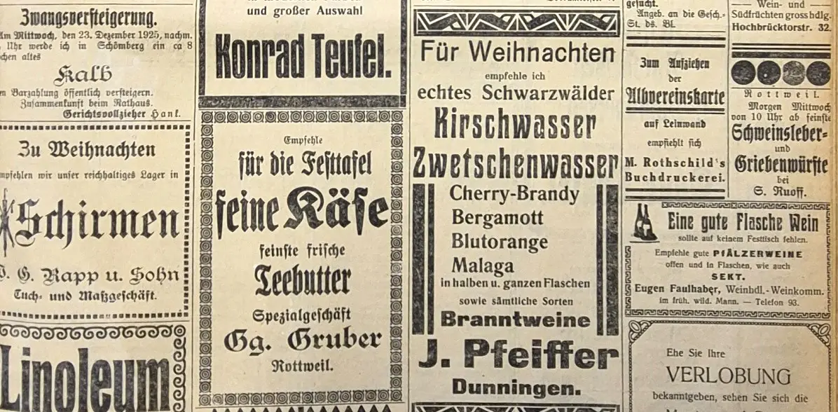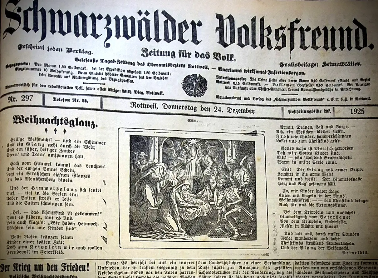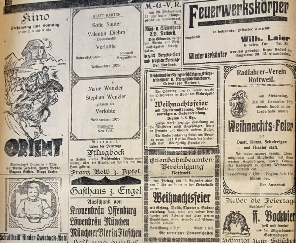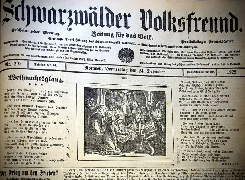 Immerhin ließen es sich die Menschen in Rottweil und der Region nicht nehmen, in Vereinen und Verbänden zahlreiche Weihnachtsfeiern und Theateraufführungen zu organisieren. Davon berichteten, beide Zeitungen – zum Beispiel der „Volksfreund“, der in der Ausgabe vom 30. Dezember auf die Feier im Rottenmünster, bei der sich um die 700 Menschen drängten, zurückschaute: „Nicht leicht wird irgendwo Weihnachten so schön und so feierlich festlich, so feinsinnig und lieblich begangen als im Kloster der barmherzigen Schwestern in Rottenmünster“, hieß es da hochgestimmt.