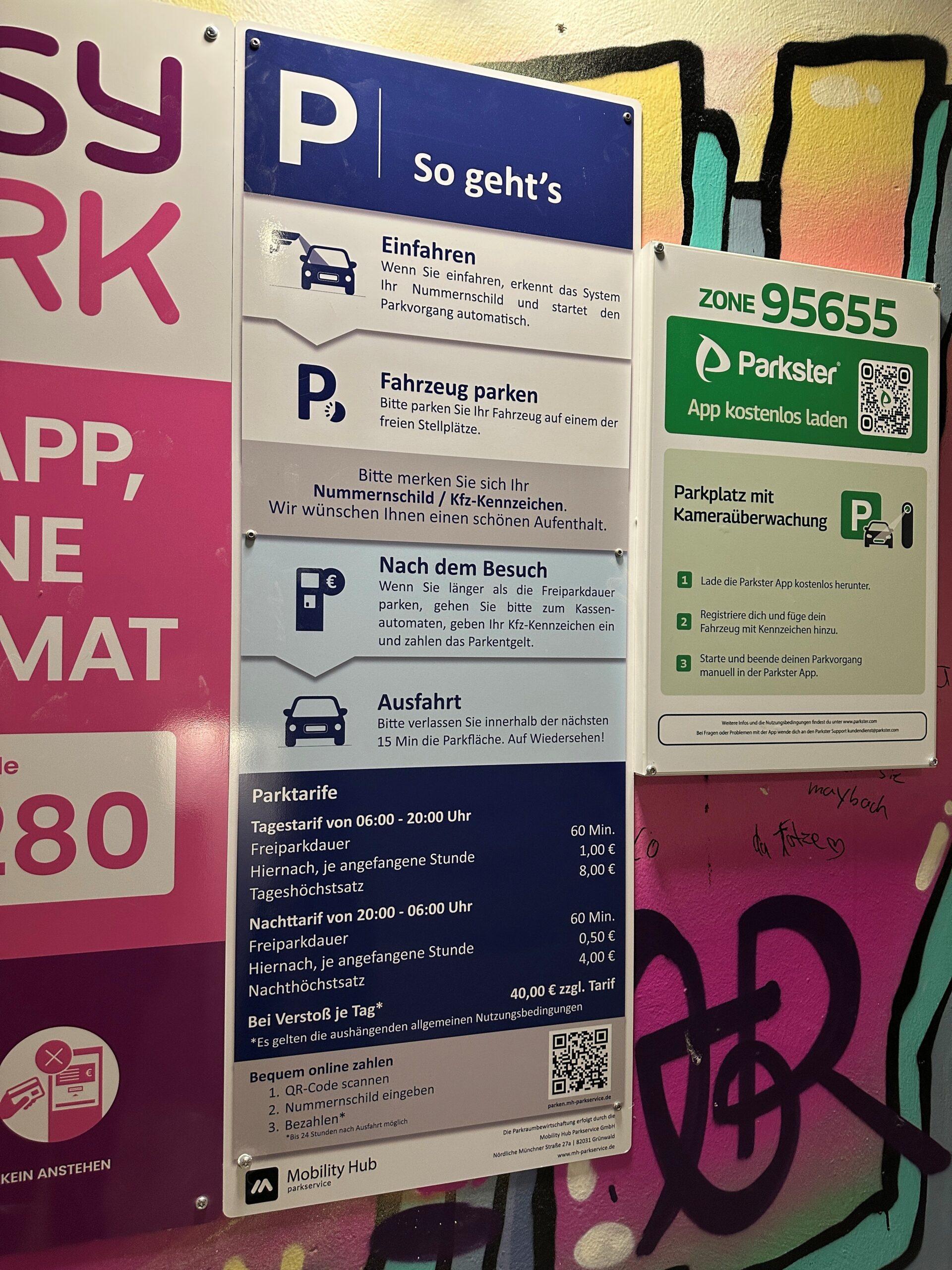 Die Vertragsbedingungen müssen vor Ort deutlich erkennbar sein – gut lesbar, am besten bereits bei Einfahrt und an zentralen Stellen. Fehlen die Hinweise oder sind sie „übersehbar“, fehlt die Grundlage für einen wirksamen Vertrag bzw. für die wirksame Einbeziehung als AGB.