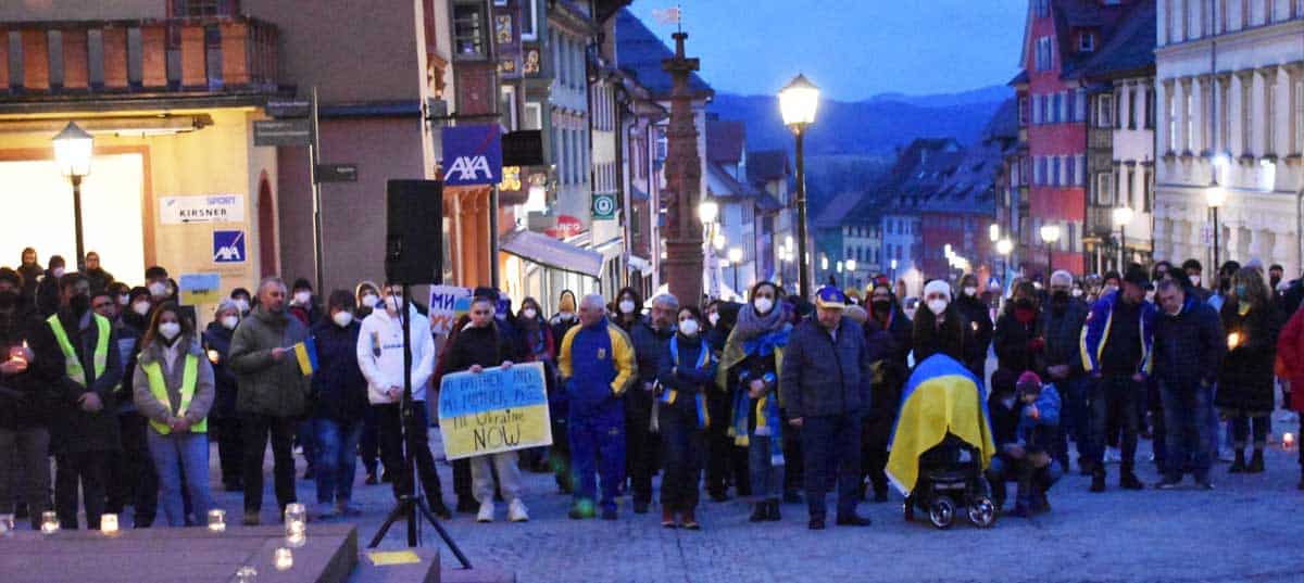 Eine starke ukrainische Gruppe zeigte blau-gelbe Fahnen. „Wir fordern Frieden und Freiheit für die Ukraine!“ Was Mirko Witkowski, Kreisvorsitzender der SPD, ausrief, fand nicht nur den Beifall der Zuhörer, sondern drückte auch aus, was die anderen Redner sagten.