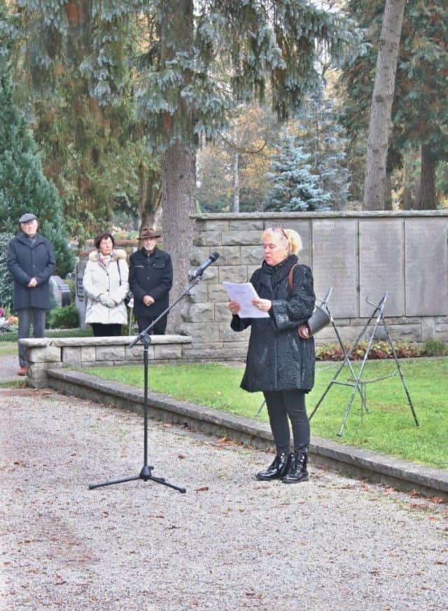 Die Ansprache hielt Gertrud Hermle, Vorsitzende des Sozialverbands VdK. Sie sagte, Krieg kenne keine Gewinner, sondern nur Verlierer. Alleine die Kriege des 20. Jahrhunderts hätten Millionen von Opfern gefordert. Städte und Dörfer lagen in Trümmern. Die letzten über 75 Jahre seien die längste Friedensperiode in der europäischen Geschichte gewesen. Nun sei mit dem russischen Angriff auf die Ukraine wieder Krieg mitten in Europa. Wir seien heute hier, um diesen Gedenktag als einen Tag der Trauer und der Mahnung zu begehen. Der Frieden sei ein zerbrechliches Gut, das wir mehr denn je schützen müssten. Aus dem Gedanken des heutigen Tages ergebe sich für uns alle die Pflicht zur Verantwortung für den Erhalt des Friedens.