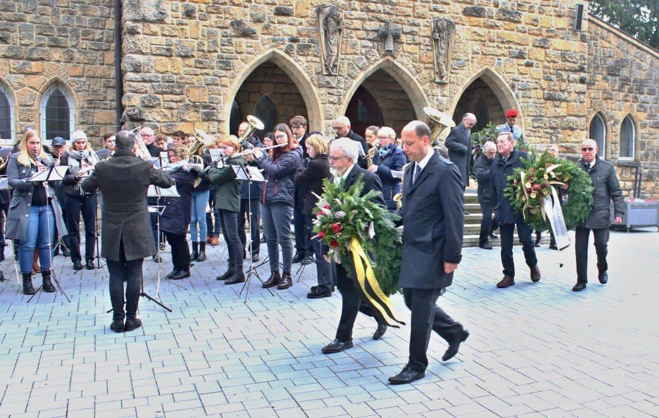 Am Ende der Feierstunde legten für die Stadt Rottweil in Vertretung des Oberbürgermeisters Arvid Sassnick und Bürgermeister Dr. Christian Ruf zusammen mit Vertretern der Ortsgruppe Rottweil des Volksbundes Deutsche Kriegsgräberfürsorge, des VdK Ortsverbands Rottweil sowie der Reservistenkameradschaft Rottweil-Oberndorf Kränze am Ehrenmal nieder. Werner Weiss vom Volksbund Deutsche Kriegsgräberfürsorge bedankte sich bei allen die gekommen sind und die zum Gelingen dieser Gedenkfeier beigetragen haben.