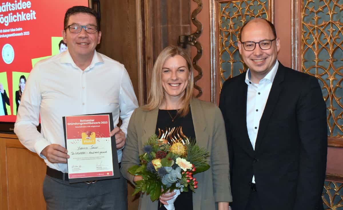 Eine Jury aus Vertretern von Stadt, GHV und Wettbewerbs-Partnern hatte die Siegerinnen und den Sieger gewählt. Wie Oberbürgermeister Dr. Christian Ruf berichtete, waren 22 Einsendungen eingegangen – „wir waren wirklich baff“. Zwei davon allerdings zogen wieder zurück, ergänzte City-Managerin Kerstin Ohnmacht. Unter diesen 20 gab es eine Vorauswahl, so dass die Jury noch zwischen 14 Einsendungen die Gewinner bestimmen musste. Eine einstimmige Entscheidung war es dann, die vorderen Plätze zu belegen, berichtete OB Ruf – dafür wurde der dritte Platz zwei Mal vergeben. „Das zeugt von einer hohen Qualität des Bewerberfelds“, merkte Ruf an. Drei der vier Preisträger kommen aus dem gastronomischen Bereich – und „es freut uns, dass die Küchenschelle bereits an den Start gegangen ist.“ Die Preise bestehen aus abgestuften „Unterstützungspaketen“ von der kostenlosen GHV-Mitgliedschaft über juristische und steuerliche Beratung bis zur kostenlosen Geschäftsanzeige.