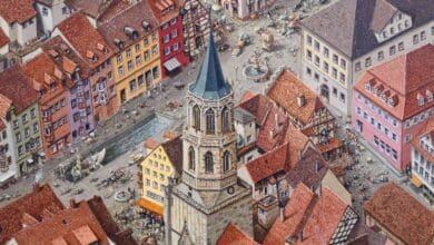 Meisterlich detailtreu hat er etliche Orte und Sehenswürdigkeiten der Region in Öl verewigt – wie Wimmelbilder wirken etwa sein Stadtpanorama…