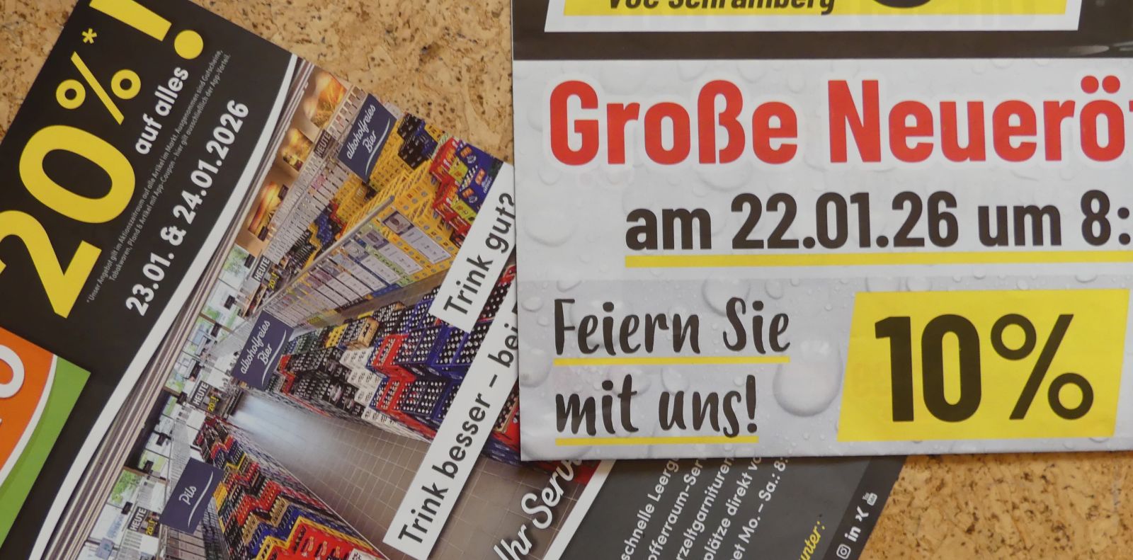 Rabatt passt. Unterdessen ist an der Bahnhofstraße ein neuer Getränkemarkt in die ehemalige Aldi-Filiale eingezogen. Eröffnet werden soll am Donnerstag. Mit einer Grillaktion, Kinderpunsch und Glühwein soll die Eröffnung gefeiert werden. Außerdem verspricht der neue Markt aus dem Edeka-Bereich in einem Werbeflyer „10 Prozent Rabatt auf das gesamte Sortiment“.