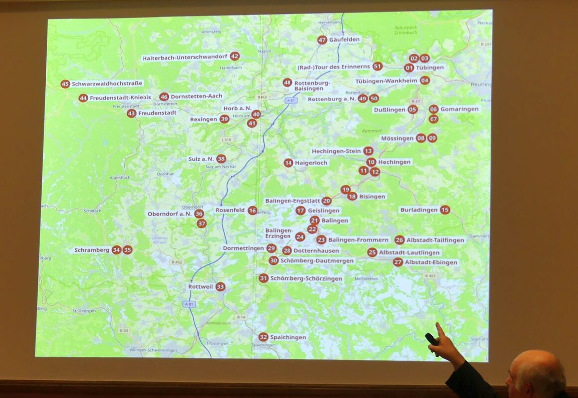 Im dritten Teil seines Vortrags stellte Kohlmann das Buch „Verbrechen. Volksgemeinschaft. Widerstand“ des Gedenkstättenverbundes Gau-Necker-Alb vor. Der Wegweiser führt zu 51 Spuren des Nationalsozialismus in unserer Region.
