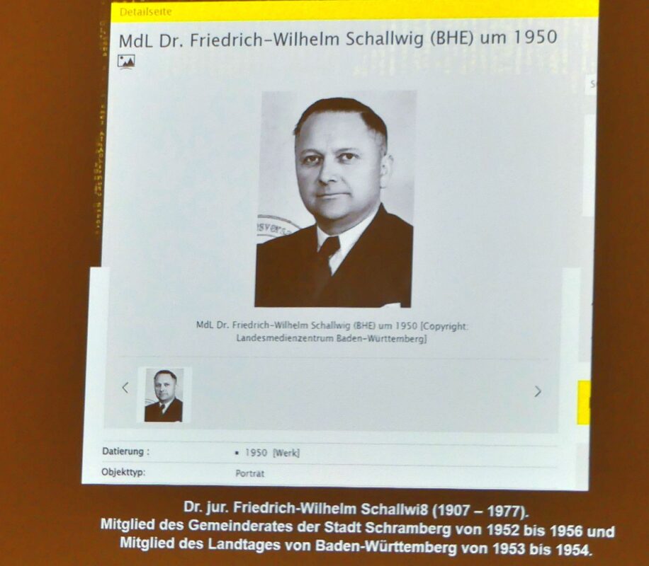 Kohlmann erinnerte auch an Friedrich-Wilhelm Schallwig. Der aus Schlesien vertriebene Jurist war von 1952 bis 56 Stadtrat in Schramberg und von 1953 bis 54 auch Mitglied des Landtags. Heute weiß man, dass er früh NSDAP- und SS-Mitglied geworden war. Im Krieg war er bei der SS-Einsatzgruppe A, die in der Sowjetunion 100.000 Menschen ermordet hat. Er musste sich nie vor Gericht für seine Taten verantworten und starb 1977 bei einem Verkehrsunfall.