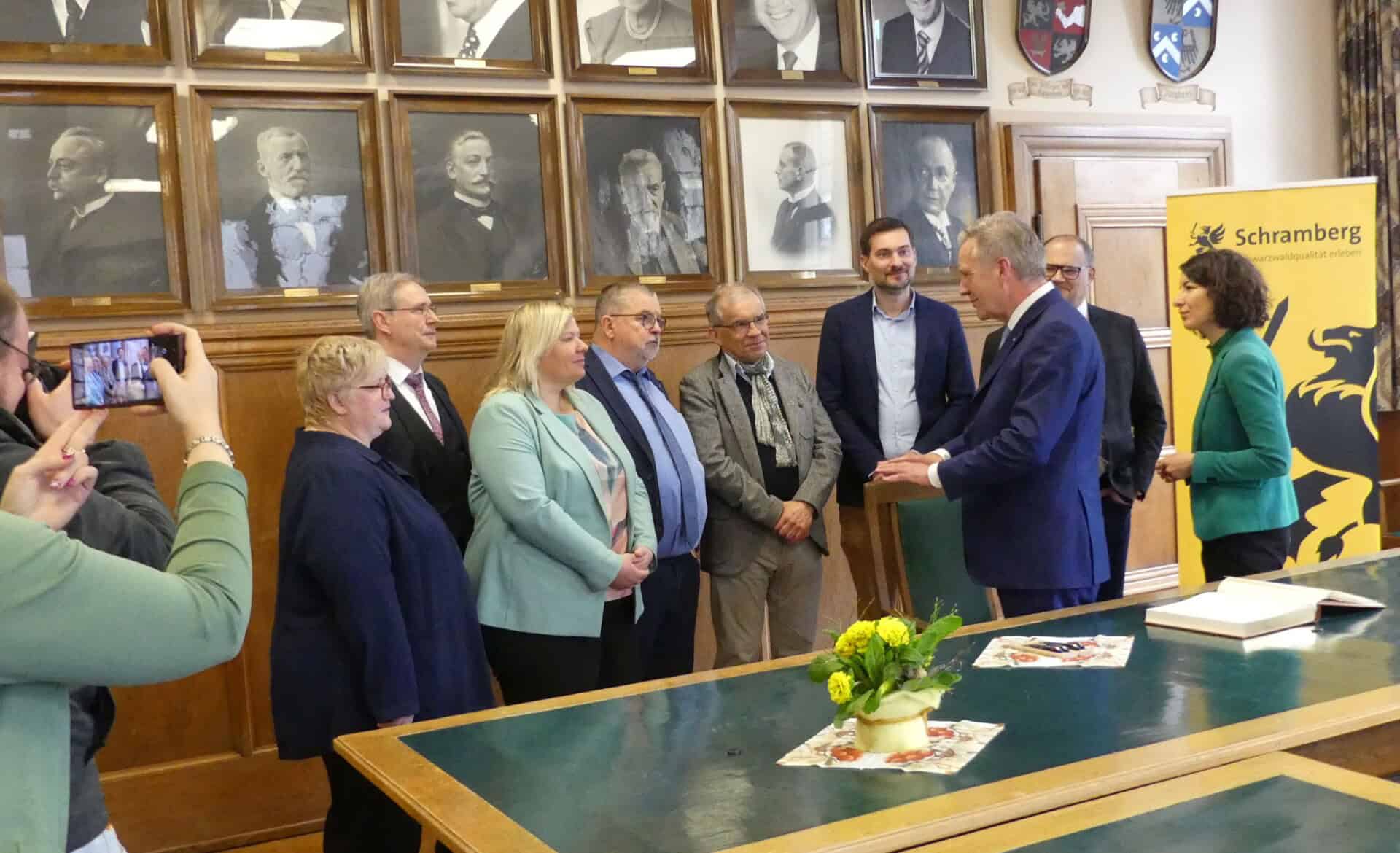 Dann geht es in den großen Sitzungssaal, Wulff plaudert mit den Kommunal- Landes- und Bundespolitikerinnen und Politiker über Denkmalschutz, seine Erfahrungen als Politiker und greift schließlich zu einem bereitliegenden Füllhalter aus Tennenbronner Produktion.