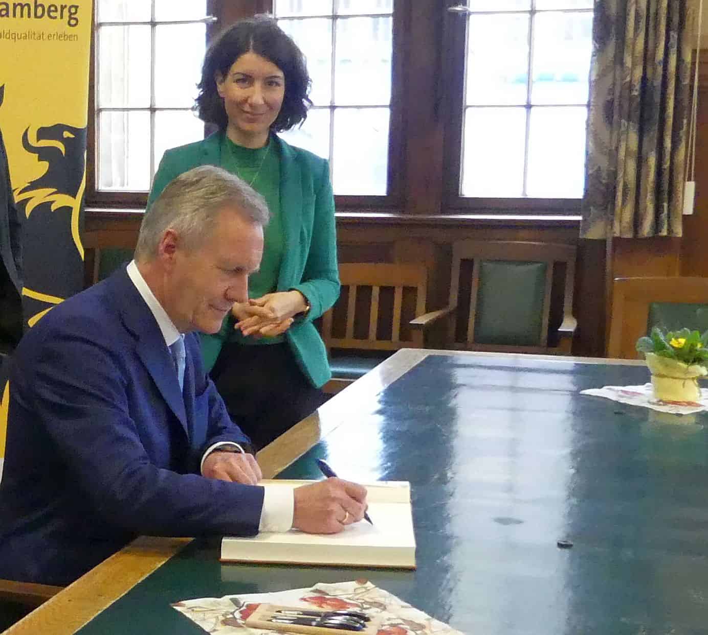Dann geht es in den großen Sitzungssaal, Wulff plaudert mit den Kommunal- Landes- und Bundespolitikerinnen und Politiker über Denkmalschutz, seine Erfahrungen als Politiker und greift schließlich zu einem bereitliegenden Füllhalter aus Tennenbronner Produktion.