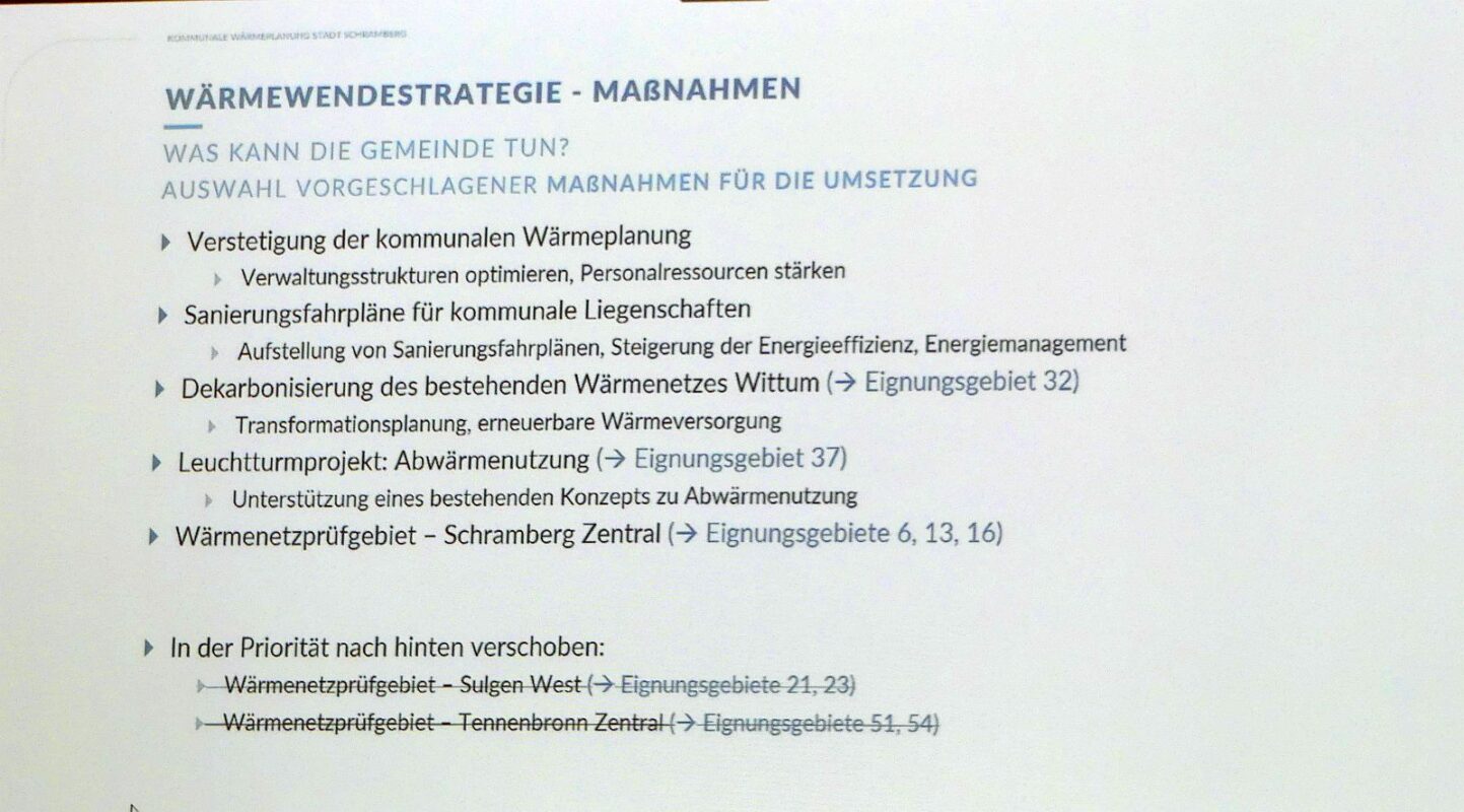 Die „Verstetigung“ der Wärmeplanung in Schramberg, eine Strategie zur Erhöhung der „Sanierungsrate städtischer Liegenschaften“, die „Dekarbonisierung des bestehenden Wärmenetzes Wittum“, die Prüfung der Machbarkeit zur Erstellung eines „Energiekonzeptes für Schramberg-Zentrum“ und die „Prüfung der Nutzung von vorhandenen Abwärmepotenzialen“ in Gewerbegebieten.