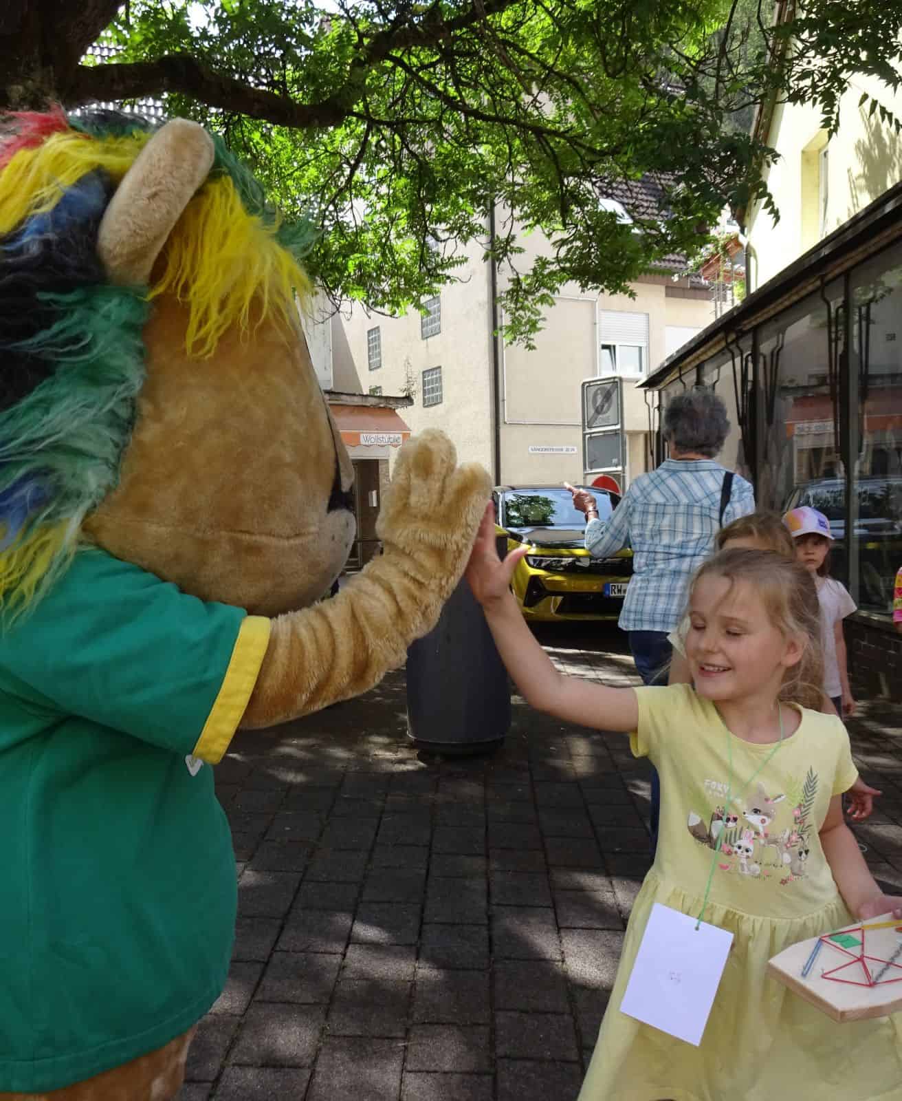 Leo, das Maskottchen des Familienferienlands, war zu Besuch gekommen. Eine Azubine des Rathauses hatte sich freiwillig gemeldet und die schweißtreibende Aufgabe übernommen.