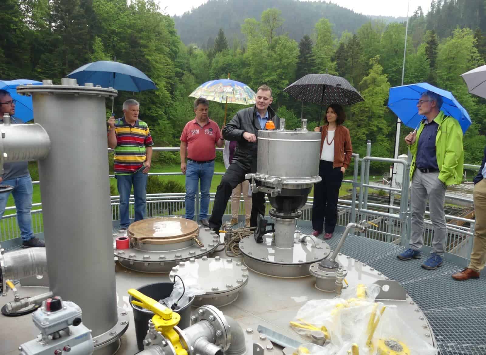 Schramberg (him) – Hoch hinaus. Der Ausschuss für Umwelt und Technik war am Donnerstagabend zunächst zu Besuch auf der Kläranlage im Schiltachtal und hat den neuen Faulturm besichtigt. Gemeinsam mit einigen Vertretern des Lauterbacher Gemeinderats bestiegen die Mitglieder den etwa 14 Meter hohen Turm.