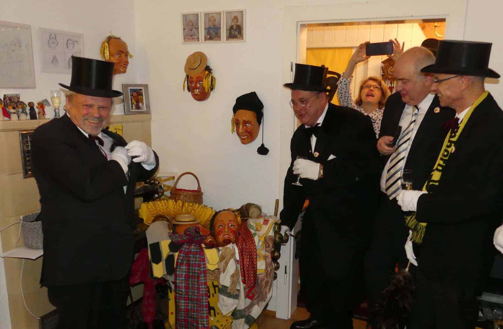 Dann hieß es: „Deckel nuff und Hendschuh an!“ Mit Zylinder und weiß behandschuht trat Hubert Dold, der Ehrenzunftmeister an die Larven seines Sohns und dessen Familie: „Sei uns gegrüßt, Du edles Kleid der Narren….“