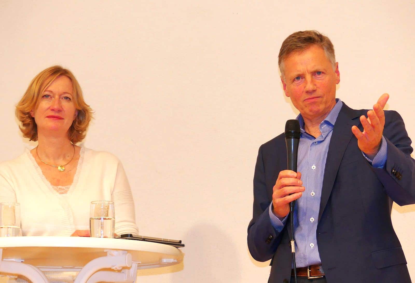 Was haben Champagner, Klopapier, Importland Deutschland und 20 80 miteinander zu tun? Diese Begriffe standen auf dem Stichwortzettel von Kerstin Andreae bei einem Vortragsabend von „Marktplatz Kirche“ im evangelischen Gemeindehaus in Sulgen. Gemeinsam mit Stadtwerke-Geschäftsführer Peter Kälble sprach die aus Schramberg stammende Ex-Grünen-Politikerin und heutige Hauptgeschäftsführerin des Bundesverbandes der Energie- und Wasserwirtschaft, kurz BDEW, über „Energiepolitik unter Druck“.