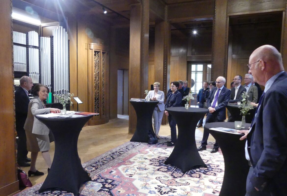 Doch vor einem Jahr war das Kuratorium der Denkmalstiftung Baden-Württemberg nach Schramberg auf Gut Berneck zu einer Sitzung zusammengekommen. Dabei war auch die Ministerin für Landesentwicklung und Wohnen Nicole Razavi. Hausherr Dr. Hans-Jochem Steim hat bekanntlich eine Schiedmayer Scheola-Orgel-Harmonium-Celesta erworben und aufwändig restaurieren und spielbar machen lassen Hier zu hören und zu sehen. Aus Anlass des Besuchs der Denkmalfachleute war der Orgelrestaurator Matthias Müller gekommen, um das außergewöhnliche Instrument vorzustellen.