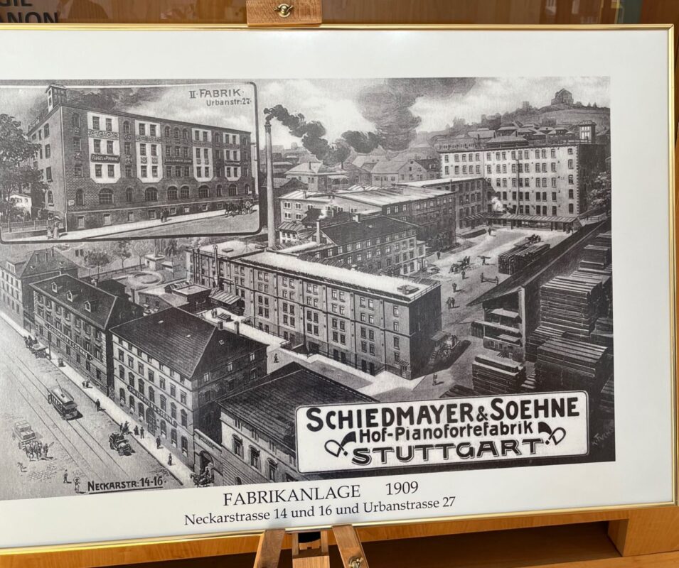 Info: Von 1821 bis Juli 1944 standen die Firmengebäude – gebaut vom Hofbaumeister Nikolaus Friedrich von Thouret – genau an der Stelle des neu benannten Platzes. Die Schiedmayer-Fabrik war im zweiten Weltkrieg stark beschädigt worden. Einen Wiederaufbau wollte man in Stuttgart aber nicht. Ab Sommer 1965 sollte an der Konrad Adenauer-Straße, der früheren Neckarstraße, eine Kulturmeile entstehen. An dieser Stelle baute man das das Haus der Geschichte, die Musikhochschule, das Haus der Abgeordneten und die Württembergische Landesbibliothek.