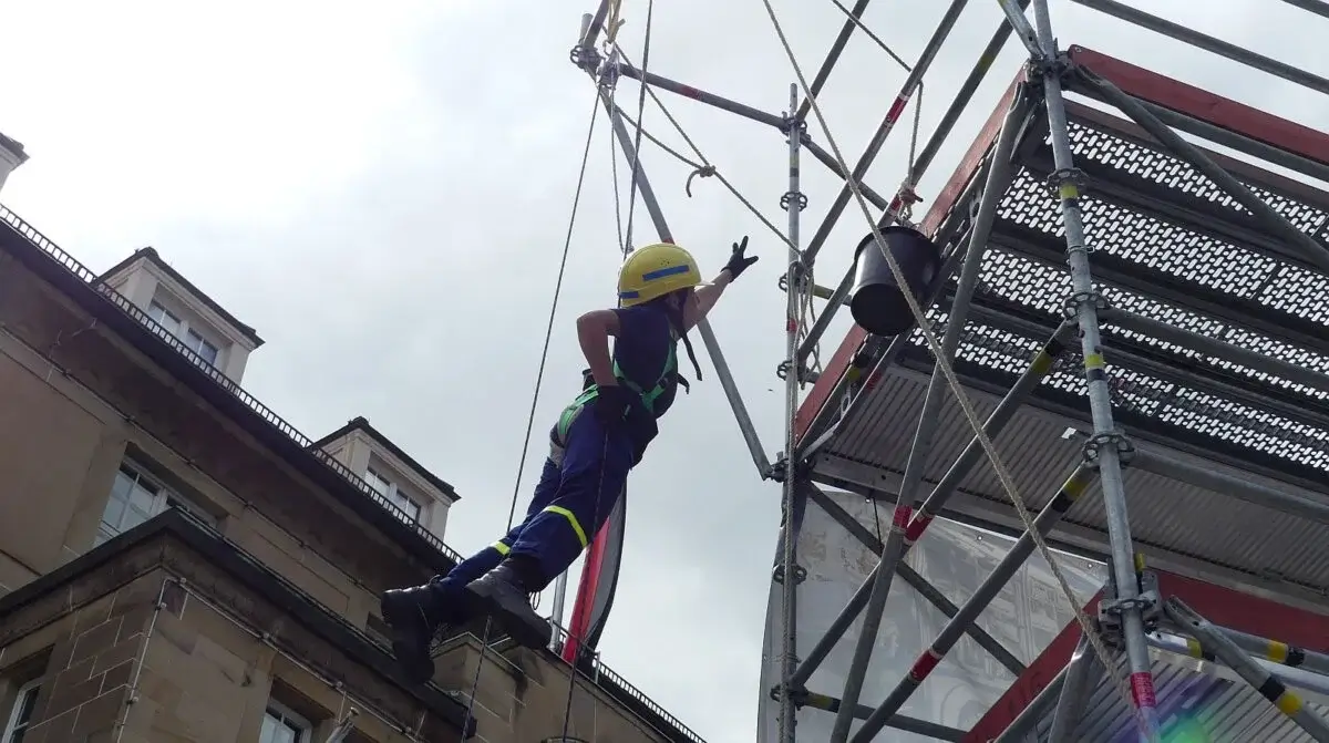 Ein paar Minuten später kommt eine Gruppe zum Gerüstturm. Tiago aus Säckingen wird ausgelost. Er muss das Entchen oben in den Eimer werfen. Beim ersten Mal braucht das Team noch recht lange, doch dann ändern sie die Taktik: Statt das Seil durch die Hände gleiten zu lassen, halten sie es fest und laufen rückwärts. Ruck zuck hat Tiago das nächste Entchen im Eimer.