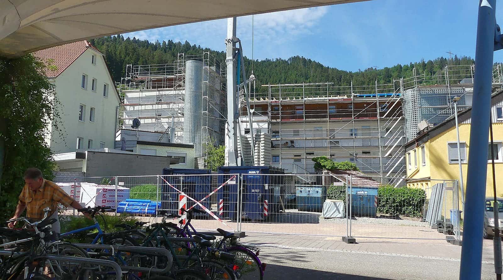 Schramberg – Ein Kran beim Busbahnhof zeigt: hier entsteht etwas. Nein, es werde nicht die Endhaltestelle für die neue Straßenbahn von Schiltach gebaut, scherzt die Chefin der Schramberger Wohnungsbau (SWB) Monika Mayer. Die SWB lasst im Auftrag der Eigentümergemeinschaft Bacher-Hof die beiden Dächer des Wohnkomplexes und die Fassaden sanieren.