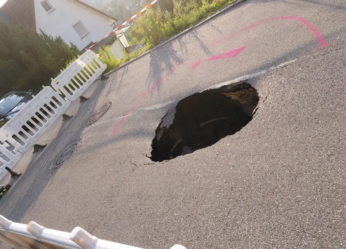 Die Mitarbeiter seiner Abteilung seien bereits auf der Suche nach einer geeigneten Baufirma, die den Schaden beheben kann. Die Durchfahrt Richtung Sulgen bleibe gesperrt, denn das Loch liege ziemlich in der Straßenmitte. „Wir wissen ja auch nicht, wie weit der Hohlraum gegebenenfalls geht.“ Sicherheit gehe auf jeden Fall vor.