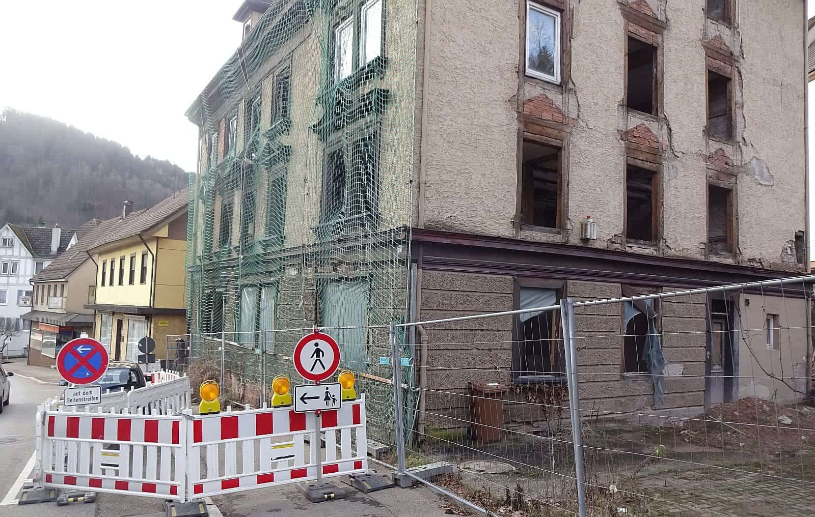 „Im neuen Jahr hat uns eine Meldung einer besorgten Bürgerin bezüglich der Brandruine erreicht. Daraufhin hat der Baukontrolleur der Stadt Schramberg das Gebäude überprüft.“ Da er die konkrete Gefahr nicht ausschließen konnte, dass Fassaden- oder Fensterteile herunterfallen und Fußgänger oder Autos gefährden, habe der Bauhof die Sperrung angebracht.